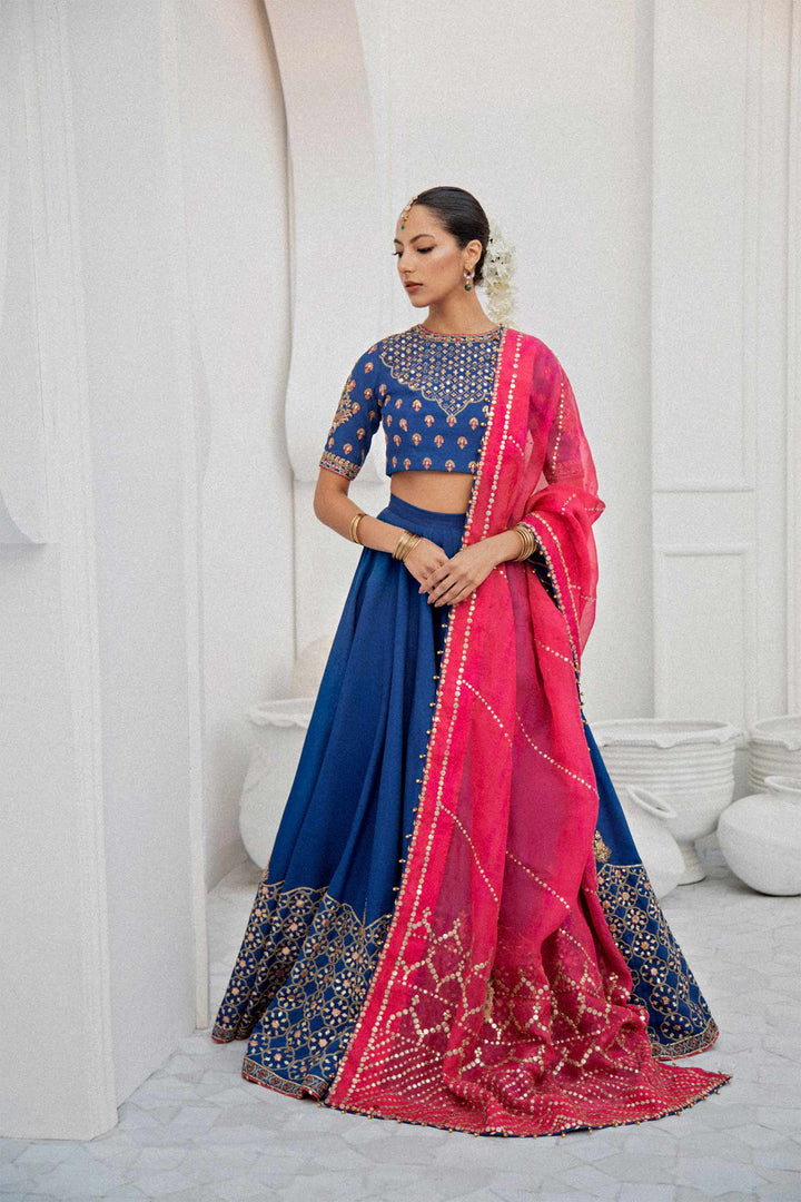 A beautifully hand crafted electric blue outfit with gota work all over and paired with a fuchsia pink tie and dye dupatta.