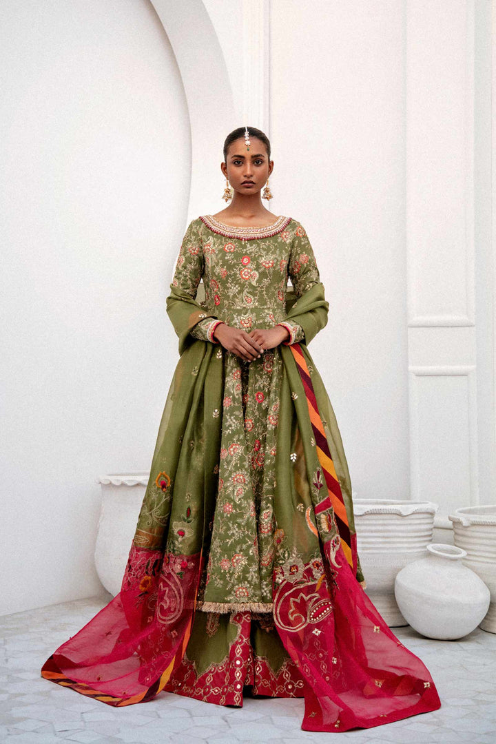 A flared peshwas crafted in green with an embroidered floral jaal, enhanced with gota and naqshi work. The lehenga is paired and embellished with gota along with a beautiful fully hand crafted green and pink dupatta with chatta patti details.
