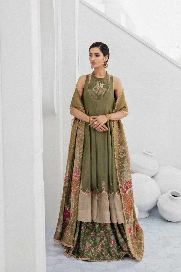 A halter neck blouse stitched to perfection and beautifully embellished with hand crafted floral bunch and kantha work. The dupatta has details of naqshi, zardozi and applique work, with a heavy floral embroidered jaal and kiran finishes.