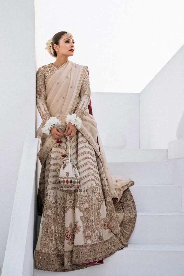 This garment is the epitome of beauty, composed with chevrons and floral motifs. It has a fully embellished lehenga embellished with zardozi, gota and maroori work, paired with a same-colored dupatta which is enhanced with a delicate boti spray.