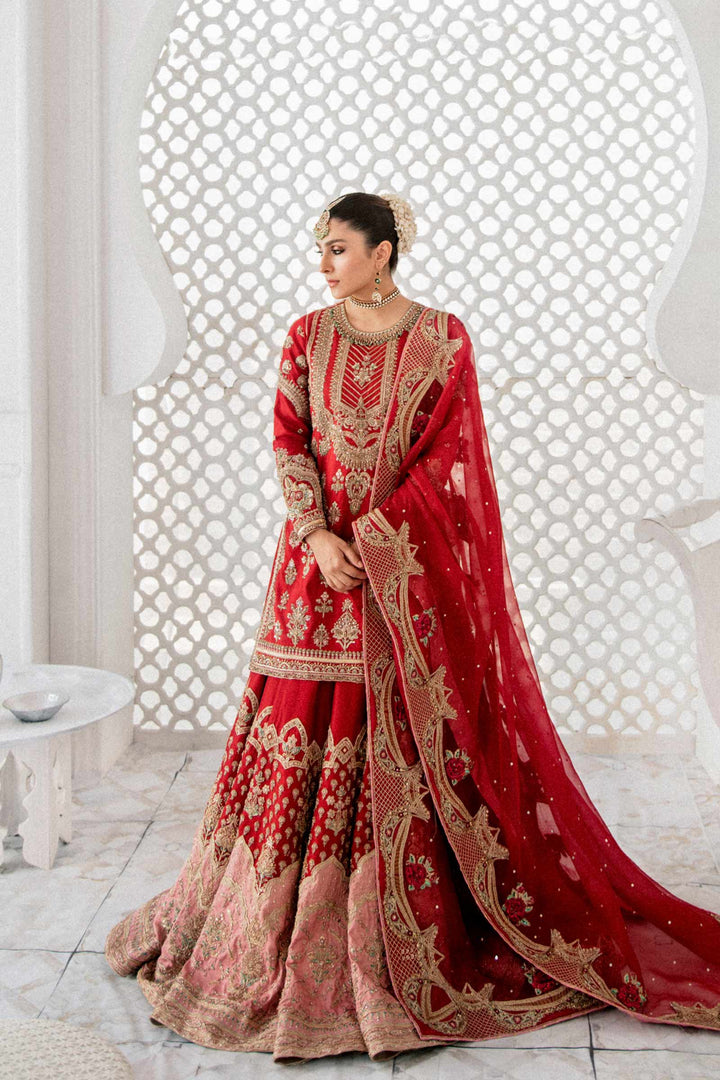 This ensemble includes a fully worked shirt with details of naqshi, sequence, dabka and pearls. The Lehenga is perfectly composed in hues of reds and pinks. It is paired with a red colored dupatta with heavily embellished scalloped borders.