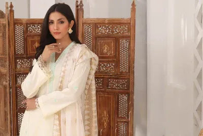 DESCRIPTION: COTTON STRAIGHT EMBROIBERED SHIRT FRONT AND BACK ALONG WITH SLEEVES. SHIRT IS MADE WITH ELEGANT LACES TO GIVE CLASSIC LOOK. PAIRED WITH ALLURING PANTS.