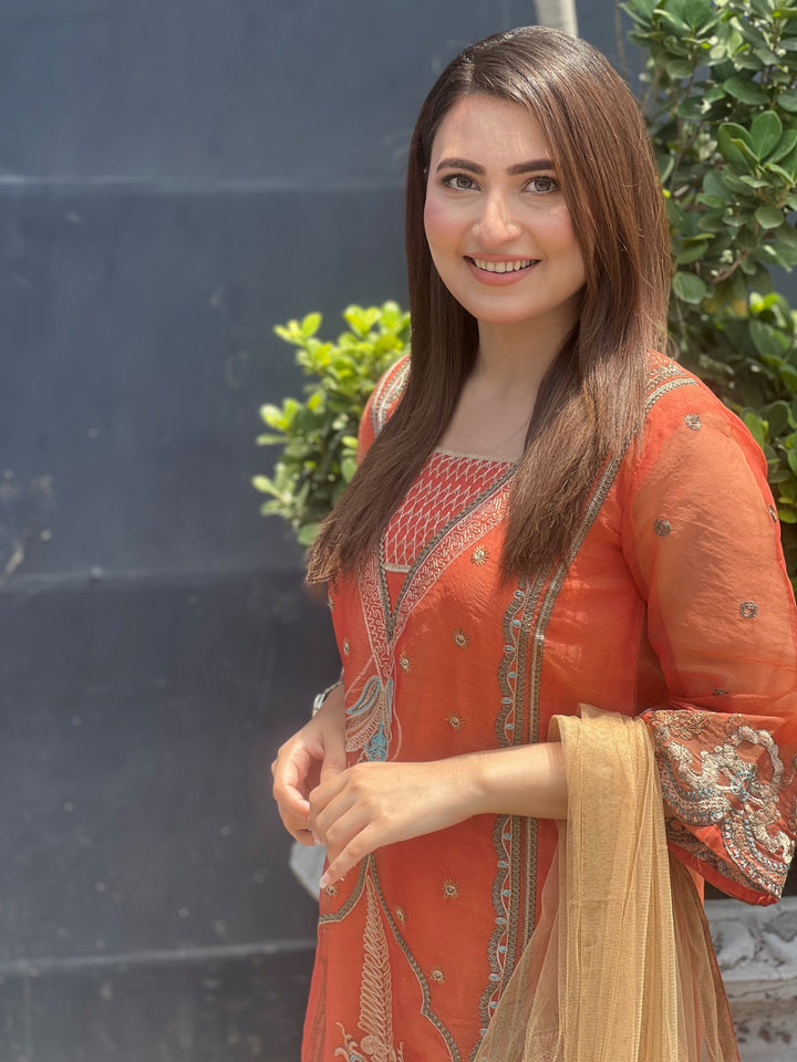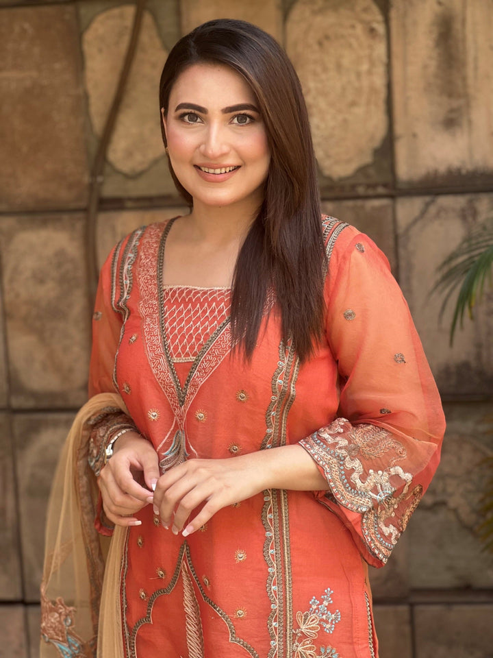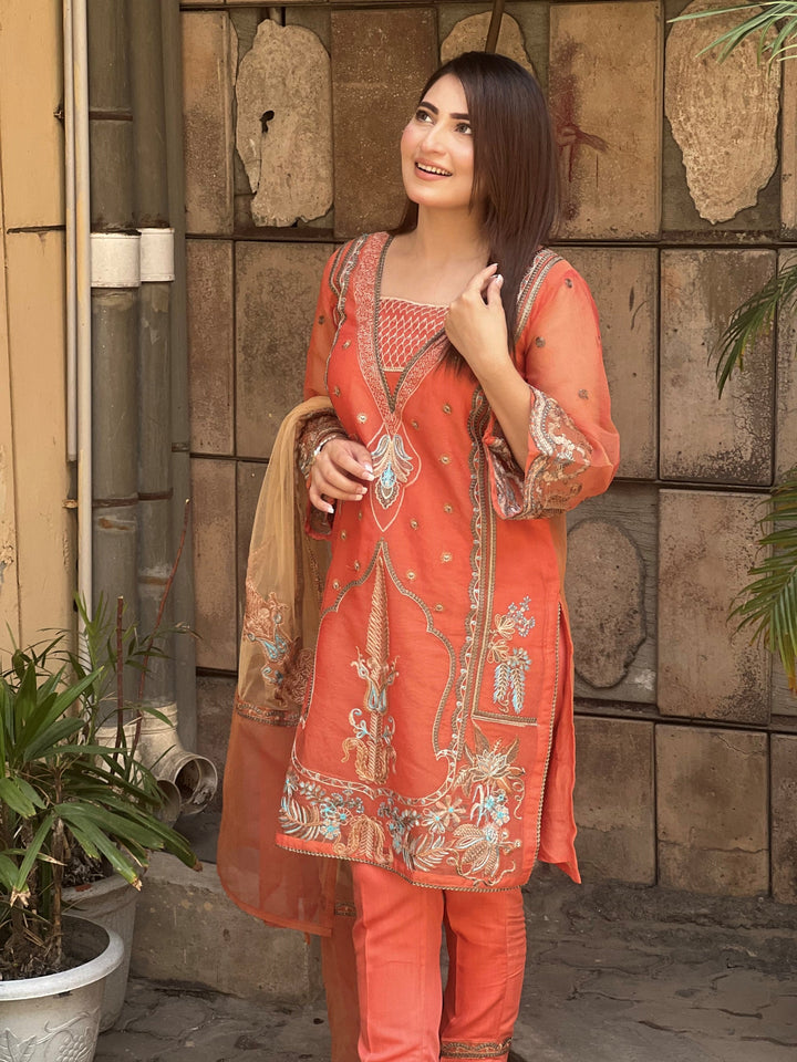 A subtle yet striking semi-formal ensemble made to perfection. This alluring multi-head organza shirt is decorated with fine embroidery work all over the front with the details of laces on it. This beautiful shirt is paired with perfectly stitched raw silk pants in the same hue. The look is completed with a contrasting skin-colored net dupatta detailed with orange organza borders with embroidery & motif patches on it giving it a distinguished appearance.