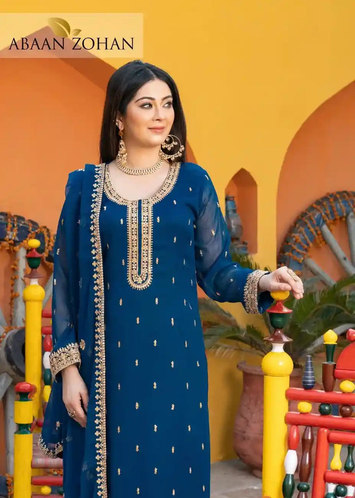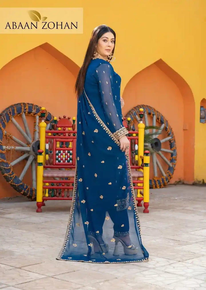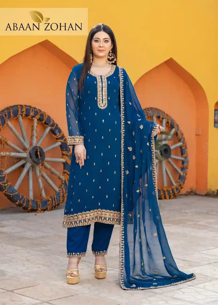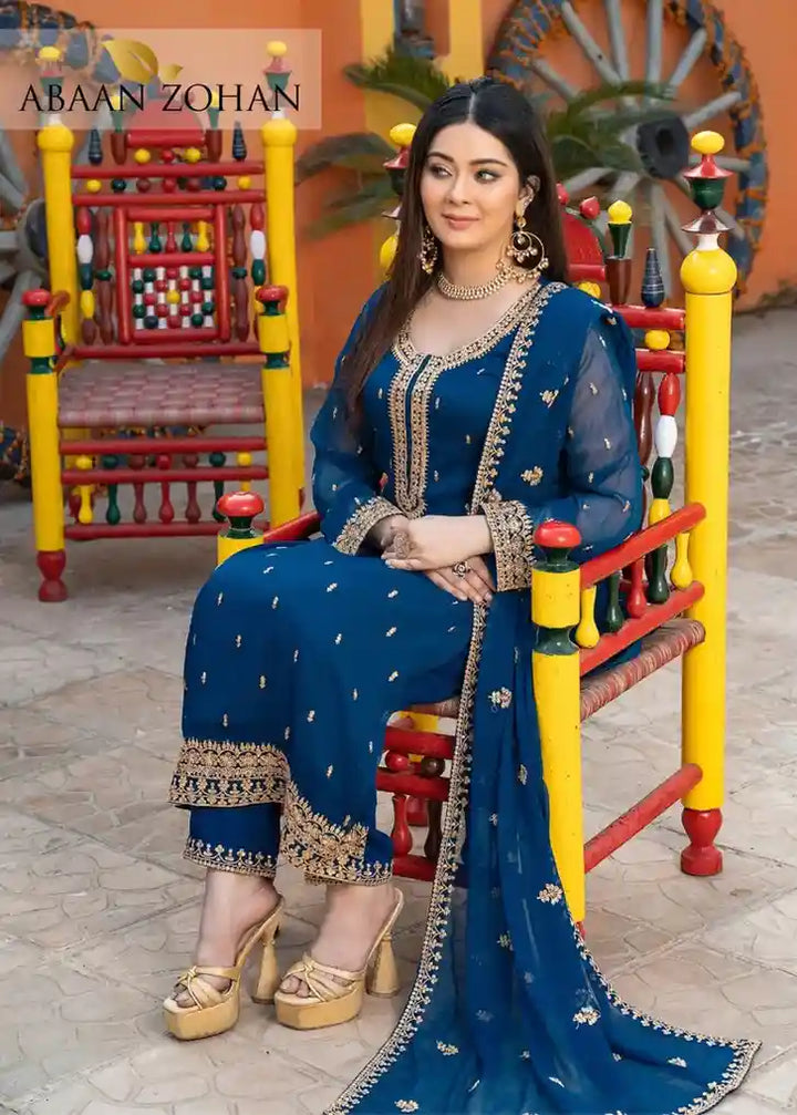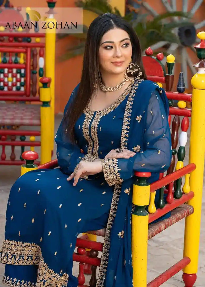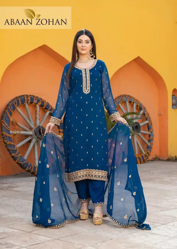 A stunning peacock-colored Eastern kurta set tailored for festive and party wear. This elegant ensemble includes an embroidered chiffon shirt, crepe trousers, and a matching chiffon dupatta. Designed with a slip attached, it’s an ideal pick for all seasons.