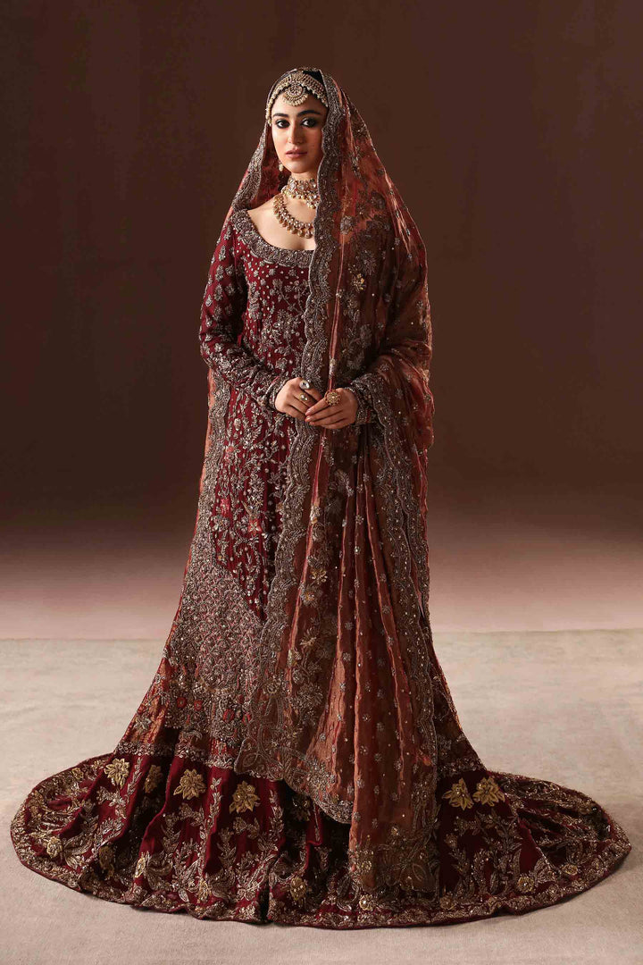 A stunning and timeless design for the bride who loves an antique gold aura with a beautiful and deep maroon pallette. A fully hand embellished shirt is covered with fine zardozi work with sequins and thread work. A two-legged, pure jamawar farshi gharara is covered with delicate vines and florals in tilla work and zarodozi with a touch of crystals. A fine silk tissue dupatta with a full scalloped border, and an addtional jaal on the head area completes this majestic bridal dress. Sure to be the perfect choice for the traditional bride.