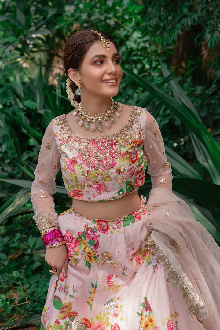 A wonderful AMMARA KHAN print is used to create this beautiful "lehnga choli". Fine zardozi work covers the blouse with gota embellishments all over the lehnga. Perfect as a bridemaid look for a close wedding festivity!