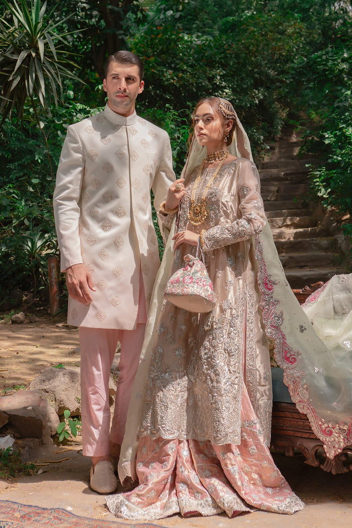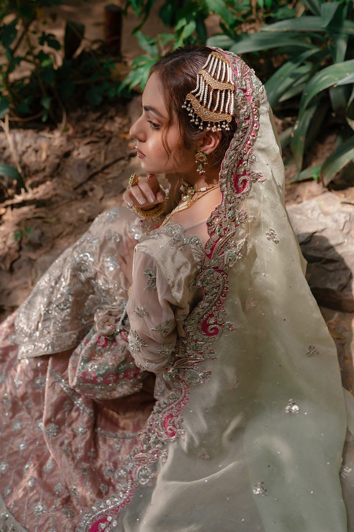 A gorgeous combination of soft metallic pink, mint and 'ganga jamni' comes together to create this masterpiece bridal attire. Purely handcrafted, it comes with hints of mukesh and bright pink pops of colour. Simply beautiful for a Nikah or engagement bride. Part of the AMMARA KHAN hierloom collection.
