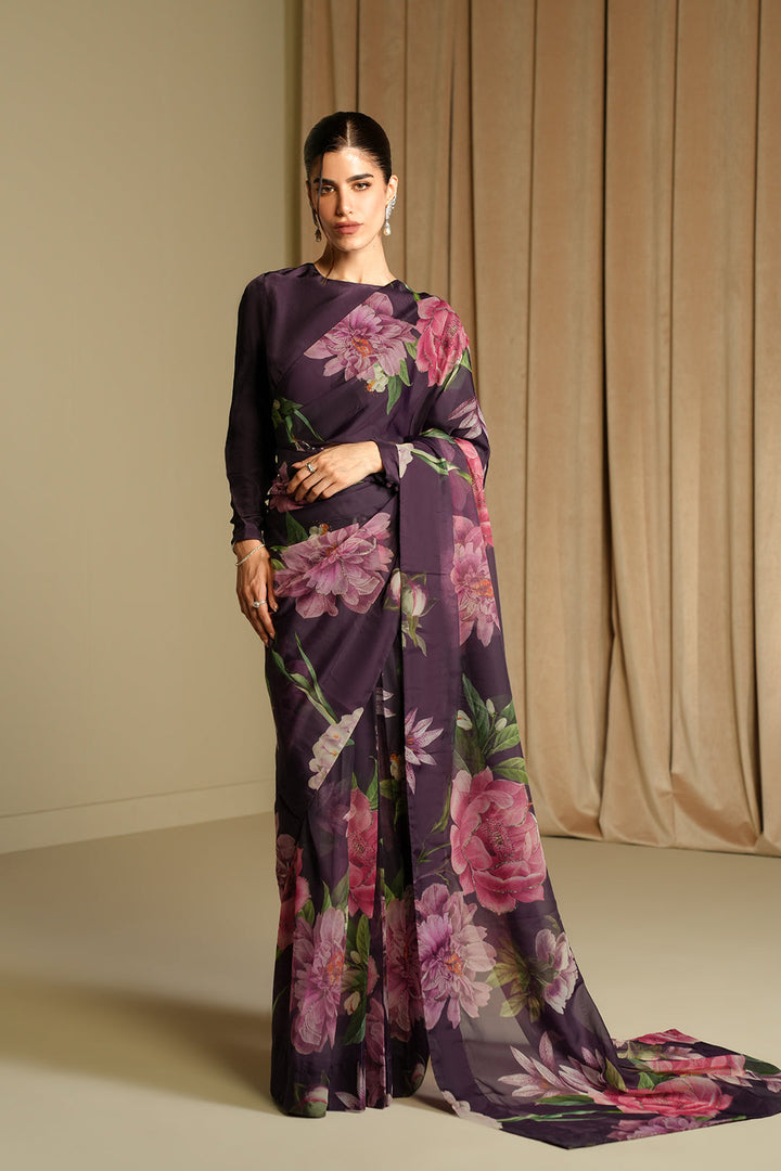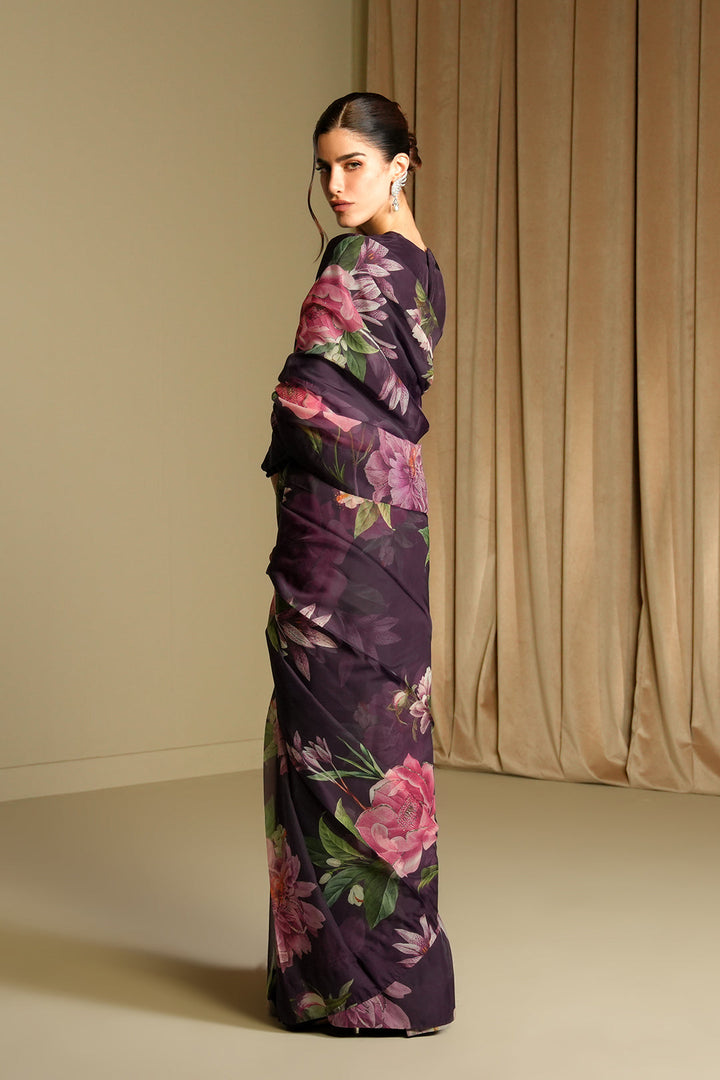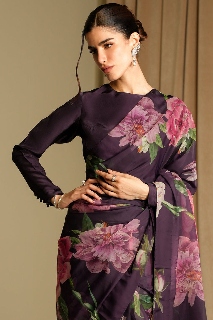Get your hands on the deep floral printed silk saree with oversized bursts of floral bouqets.