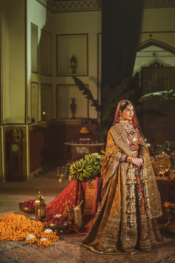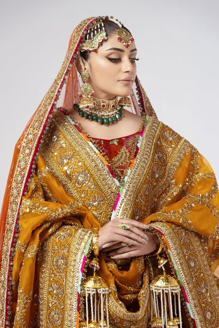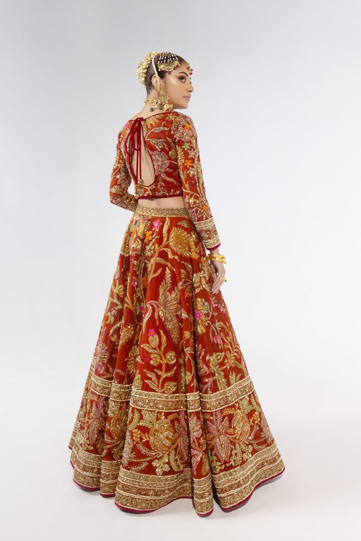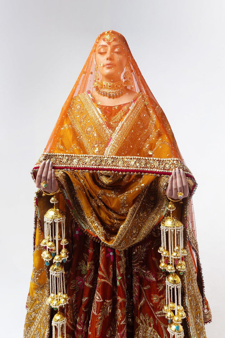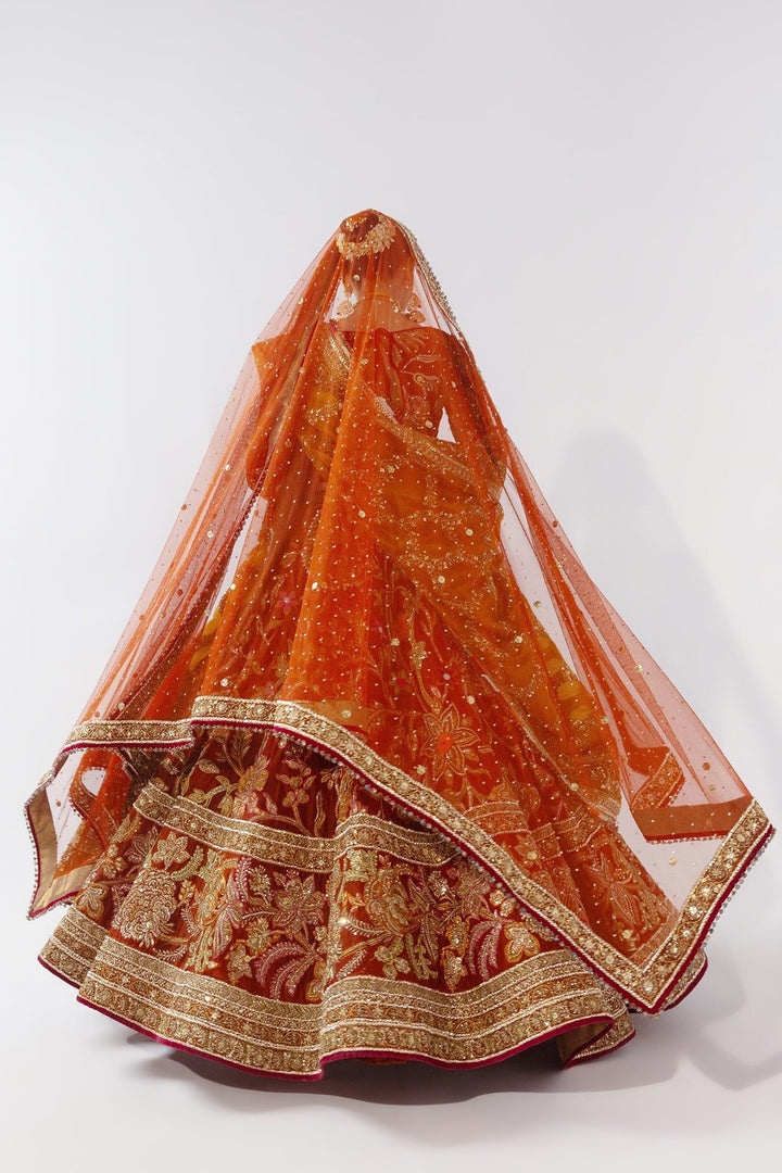 Ignite your wedding day with the radiant glow of this orange bridal ensemble. A jacquard-woven choli boasts intricate zardozi embroidery with shimmering naqshi, dabka, resham, crystals, and sequins, while the lehenga echoes the floral motif with a matching jacquard weave. A tissue-embellished belt with zardozi work cinches your waist, and a four-inch zardozi border adds captivating drama to the hem. A delicately embroidered net dupatta completes the look, while a secondary shawl woven in floral jacquard and adorned with heavy zardozi embroidery amplifies the opulent vibe.
