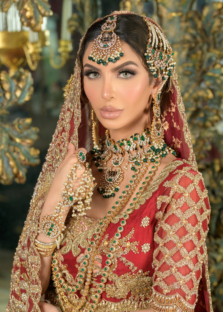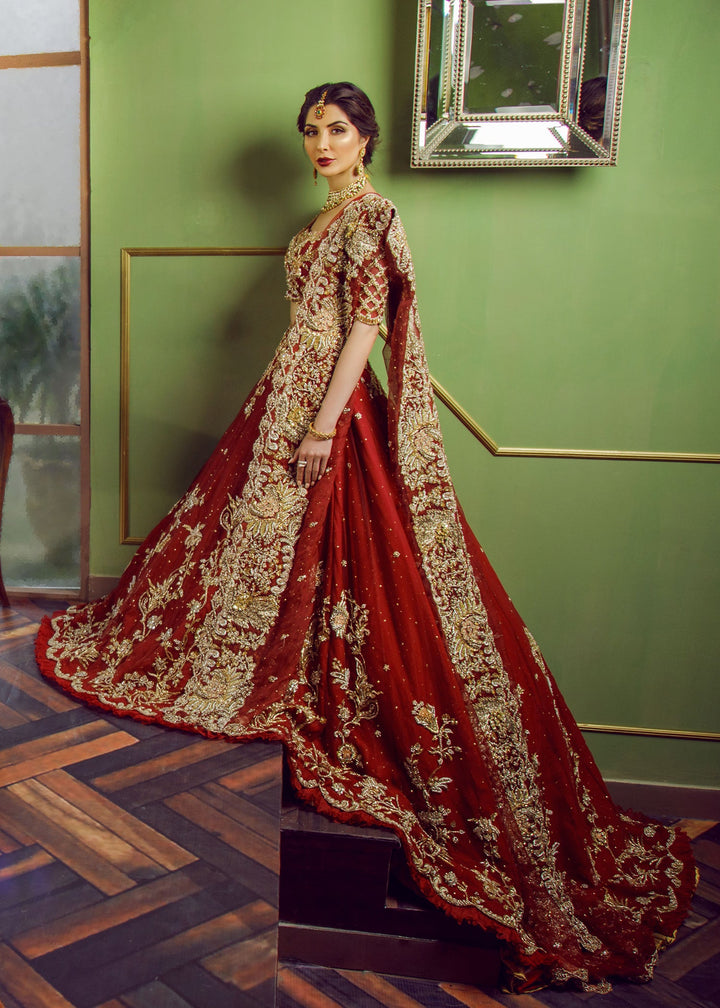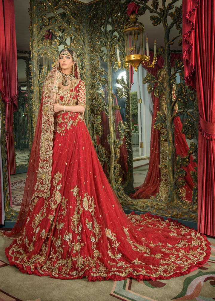 This hand crafted red bridal is a labour of love. We have put together our most popular floral vine design with intricate jaali work over an exaggerated lehnga with train to make you stand out as you walk like a regal bride.