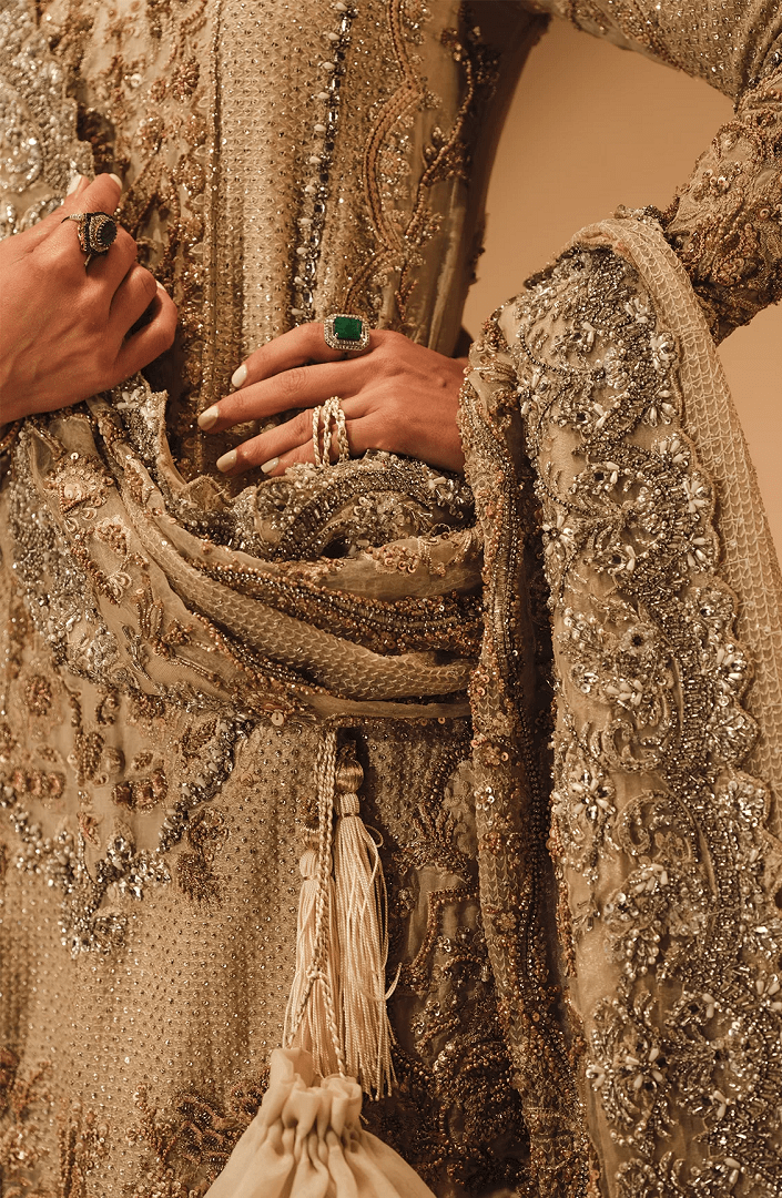 A royal bridal ensemble, meticulously crafted in the hues of french beige blended with sepia. Embellished with intricate rose gold handwork, with a hint of silver, the ensemble consists of a farshi gharara, made in organza, paired with a beautifully tailored straight organza shirt and a dupatta with wide borders, featuring elaborate patterns and shimmering details that showcases regality.