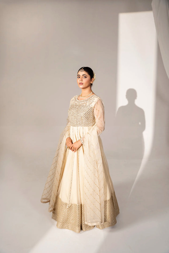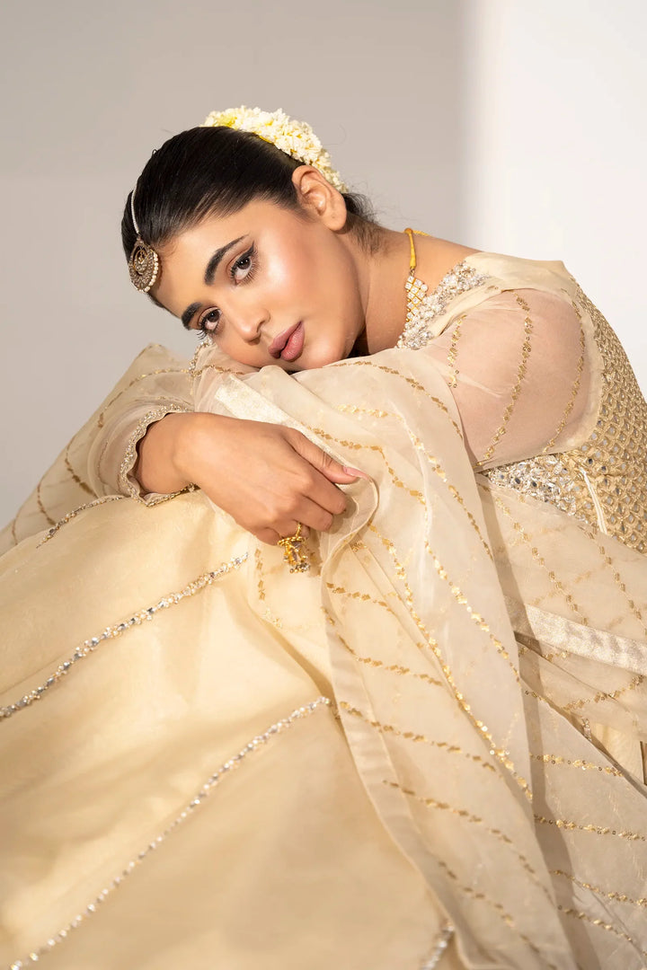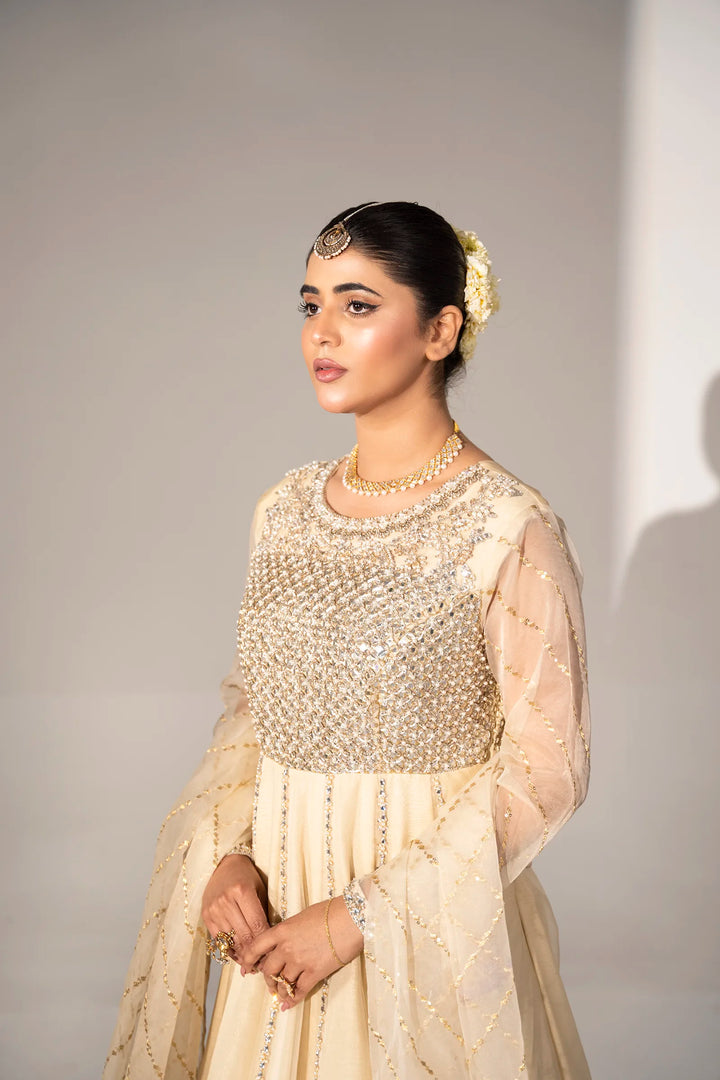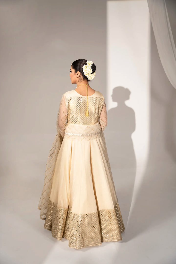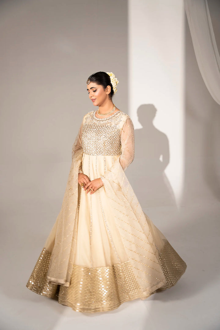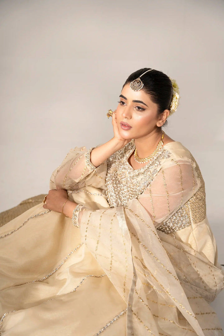 Hidden within the gleam of summer starlight, "Anisha" features an enchanting organza maxi. Detailed hand embellishments embrace the front bodice and sleeves. Each embellishment glistens, reflecting summer's tranquility. Paired with an embroidered organza dupatta cascading the silhouette, it envelops the wearer in an enchanting veil.