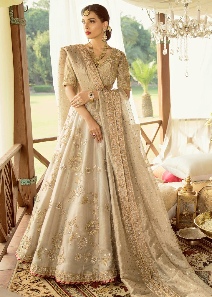 Timeless combination of silver and gold etched as floral vines enveloping a gorgeous silver gold net lehnga. We’ve paired this with a classic elbow length blouse with very fine gold work all over with a subtle contrast of coral on the dupatta borders and lehnga