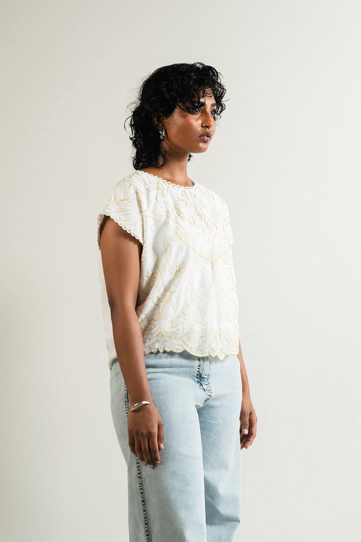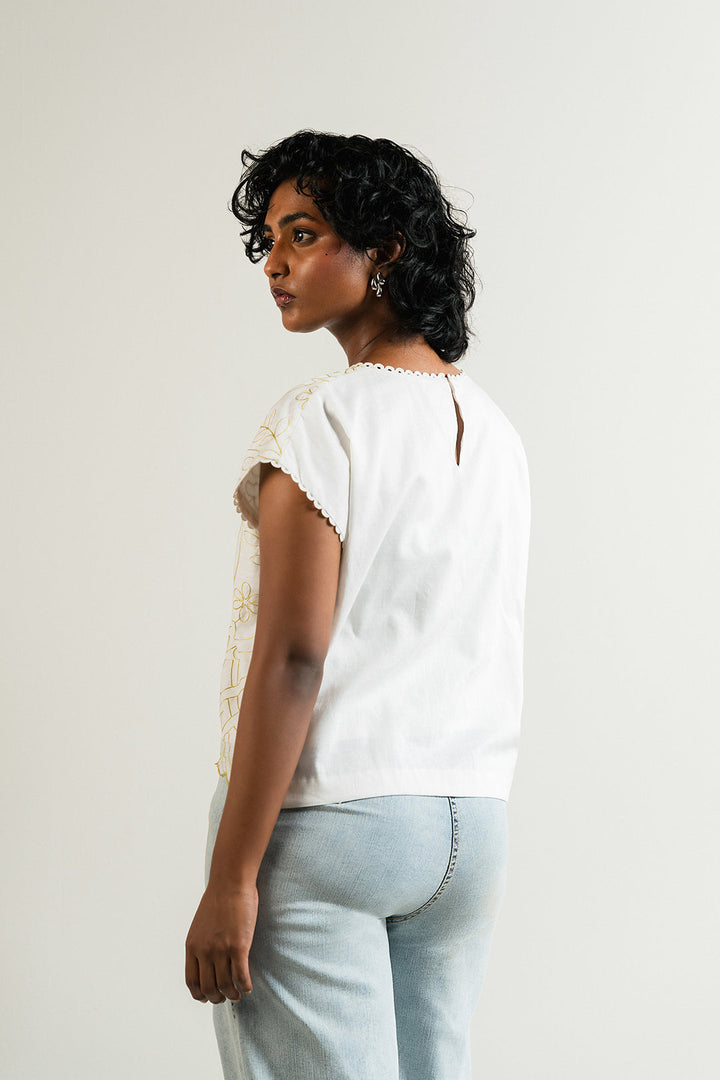 This embroidered short top made in soft linen fabric in white features crew neck with extended shoulders.