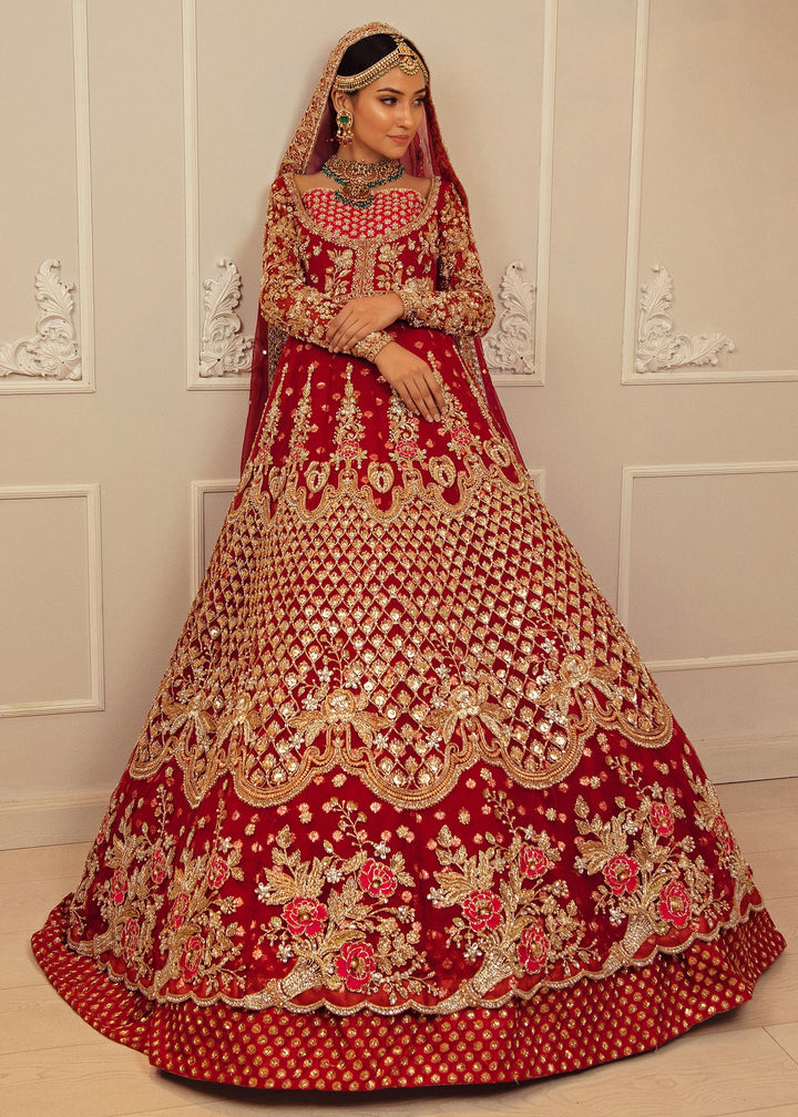 Heavily embellished with Resham and zardozi technique on a soft net base , this classic bridal featuring bouquets of Fuschia roses is one of our most elaborate bridal offers for the upcoming season. The rich craftsmanship is unmissable and exquisite in all its details.