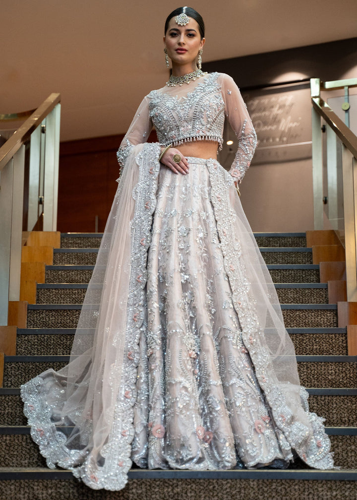 The choli is hand worked with 3D organza flowers and beautiful bunches on the sleeves comes with a fully worked bridal dupatta in net mukesh with heavy four sided borders