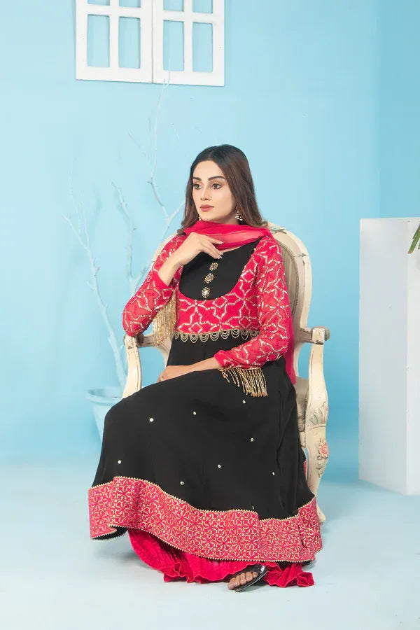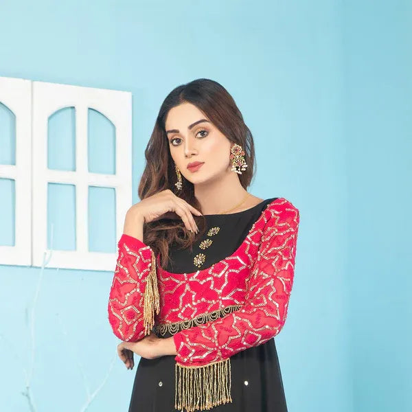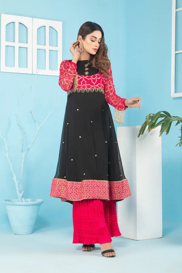 Hand-embroidered block and goat work on a chiffon shirt with an integrated chiffon yoke.