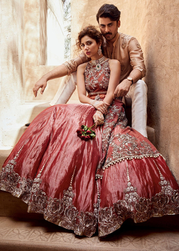 This antique rosewood bridal is meticulously hand-crafted with delicate details in various shades of silver and sprayed generously with crystals making it an unforgettable piece of couture. The the rich details of the outfit are bound to make you walk in confidence, casting a spell on the audience.