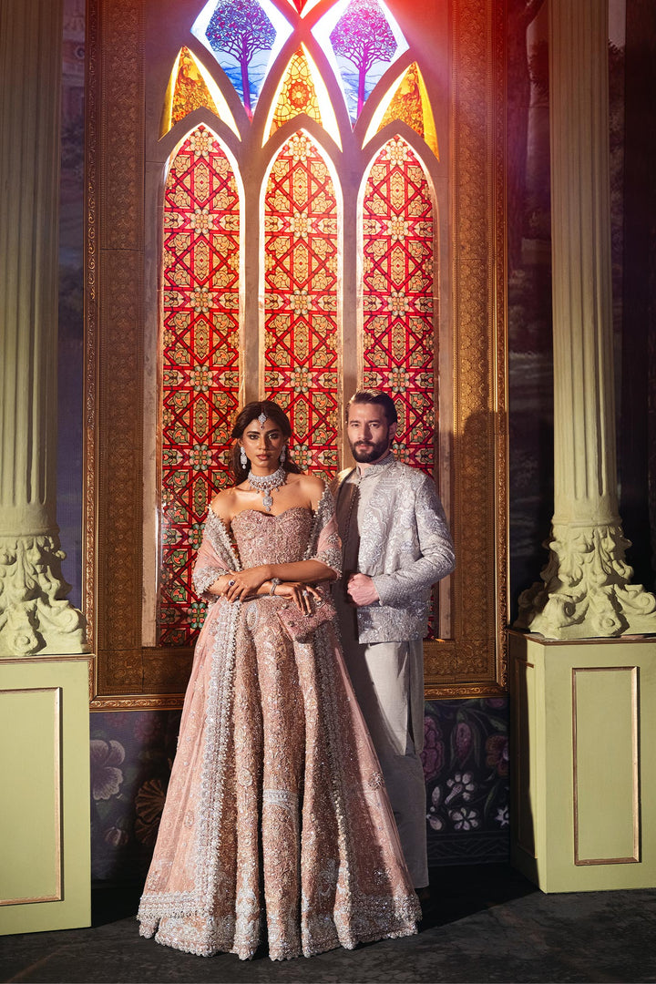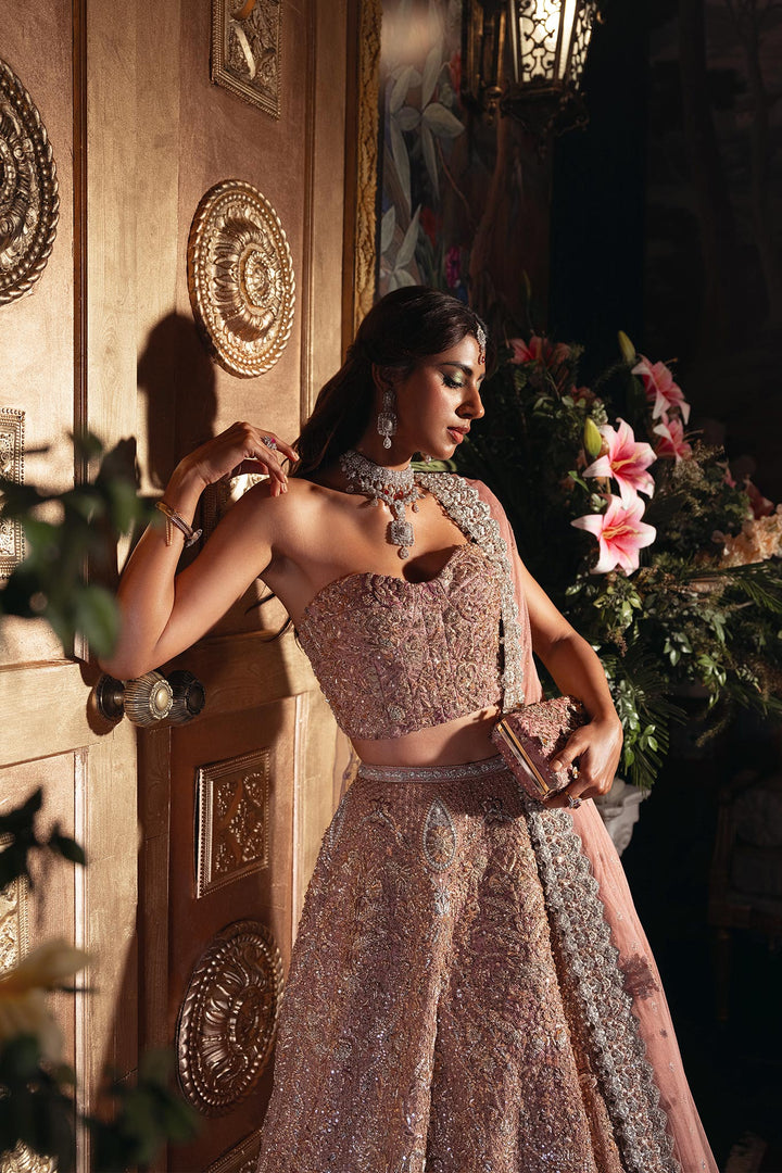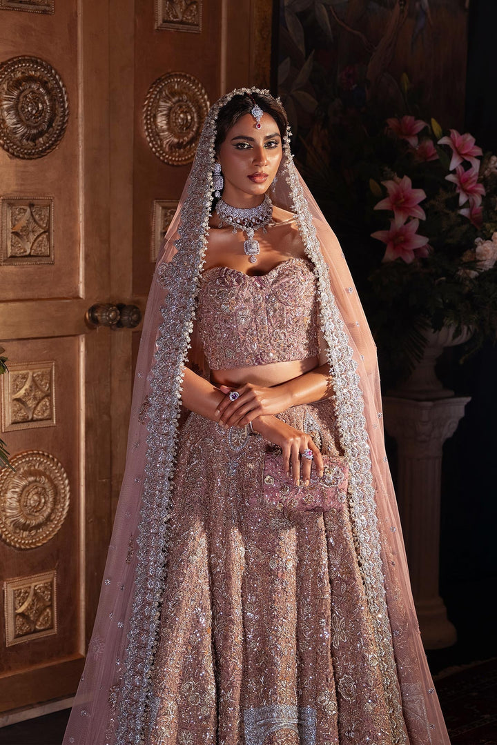 Drift down the aisle in a vision of ethereal beauty with this light lavender bridal lehenga. The net fabric shimmers with intricate embroidery, lavishly embellished with gleaming zardozi work. This exquisite technique adds a touch of royalty and grandeur to the outfit. The lehenga is paired with a complementary choli and dupatta, ensuring a cohesive and breathtaking ensemble that will leave you feeling like the most radiant bride on your special day.