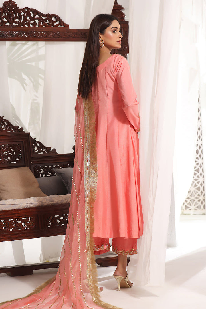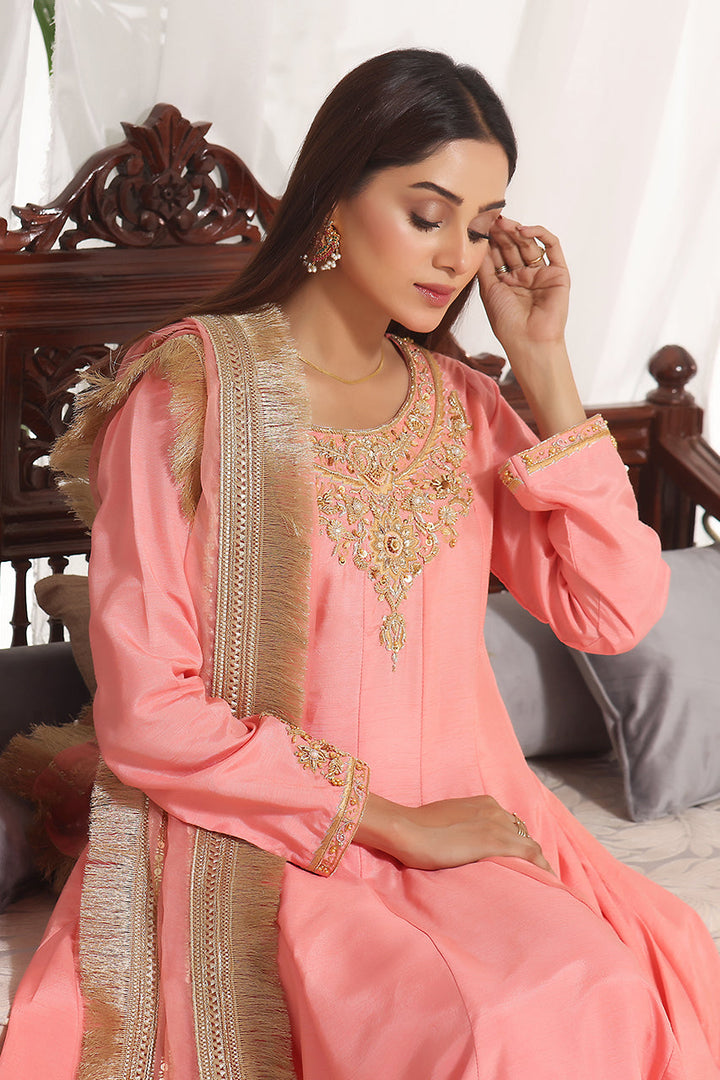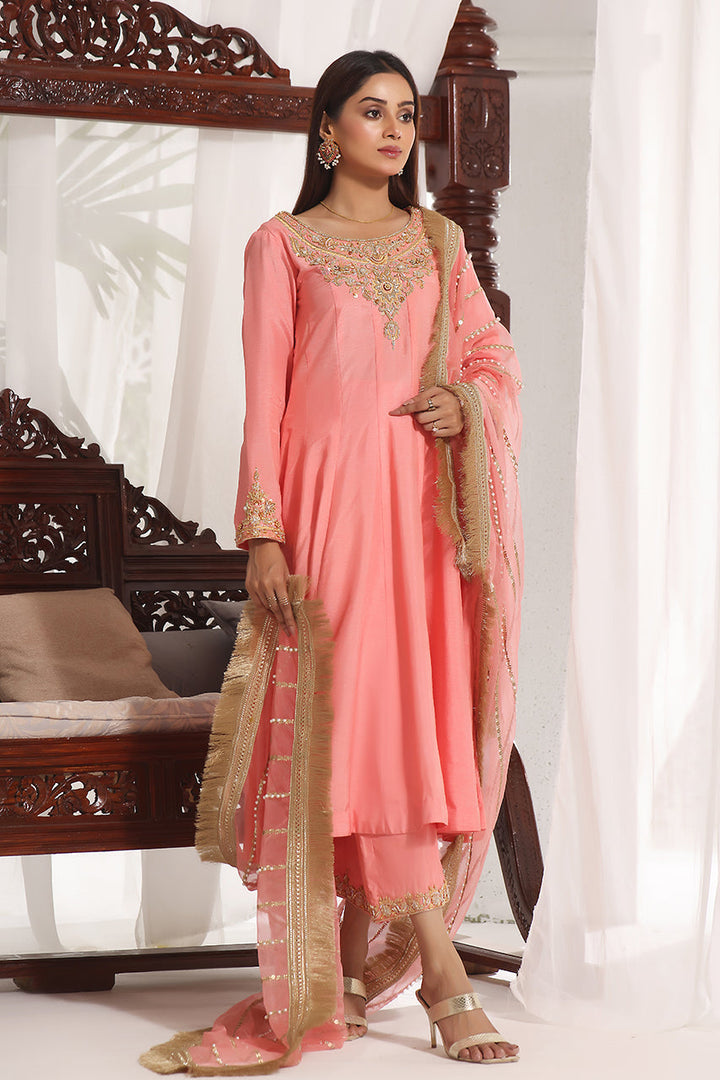 An elegantly crafted panelled frock in a classic peach colour. Embellished with handwork on the neckline, it comes with matching rawsilk pants completed with a handwork border at the bottom. Paired with a beautiful organza dupatta embelished with pearls and sequin lines all over, this sultry ensemble is a perfect for any formal occasion.