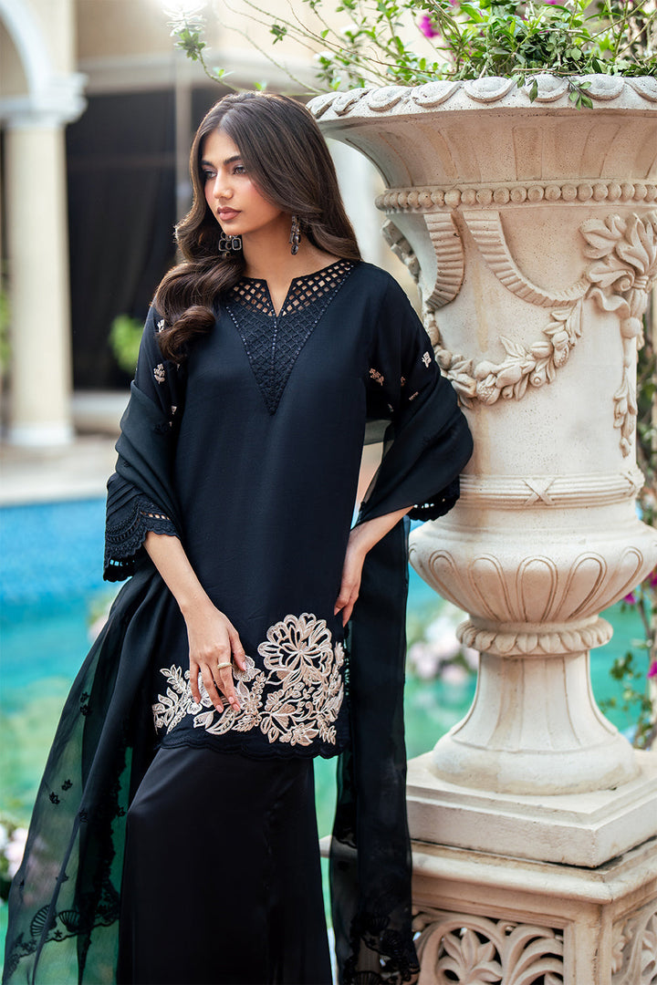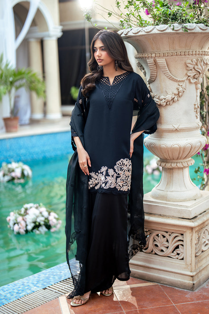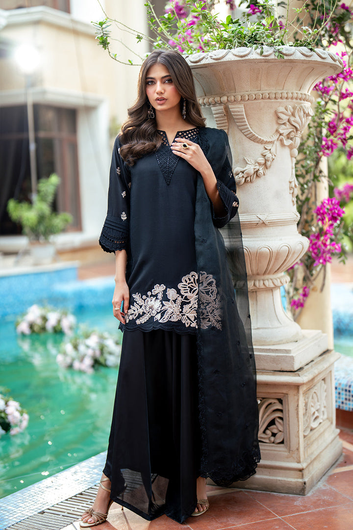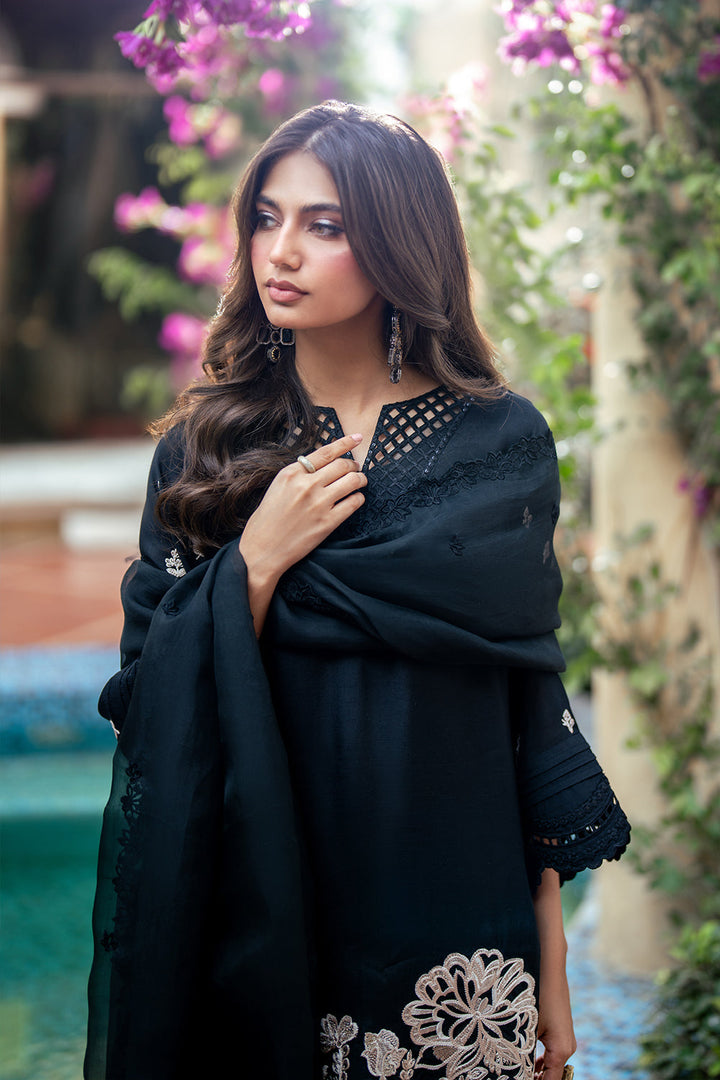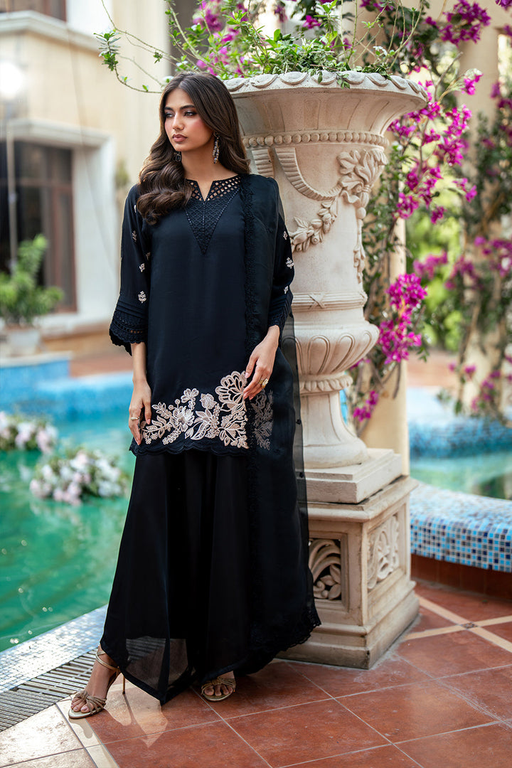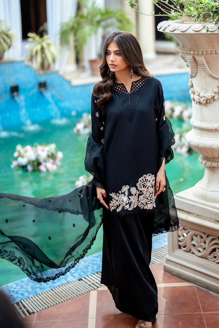 Drenched in deep black, Charcoal Whisper is crafted from luxurious raw silk, exuding timeless sophistication. Paired with Silk sarong pants and Pure Organza Dupatta, this ensemble redefines contemporary grace with a sleek, effortless flow.