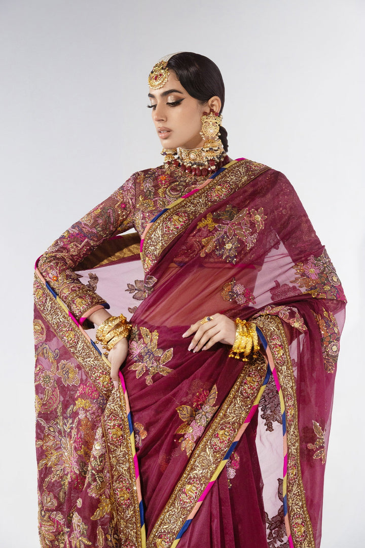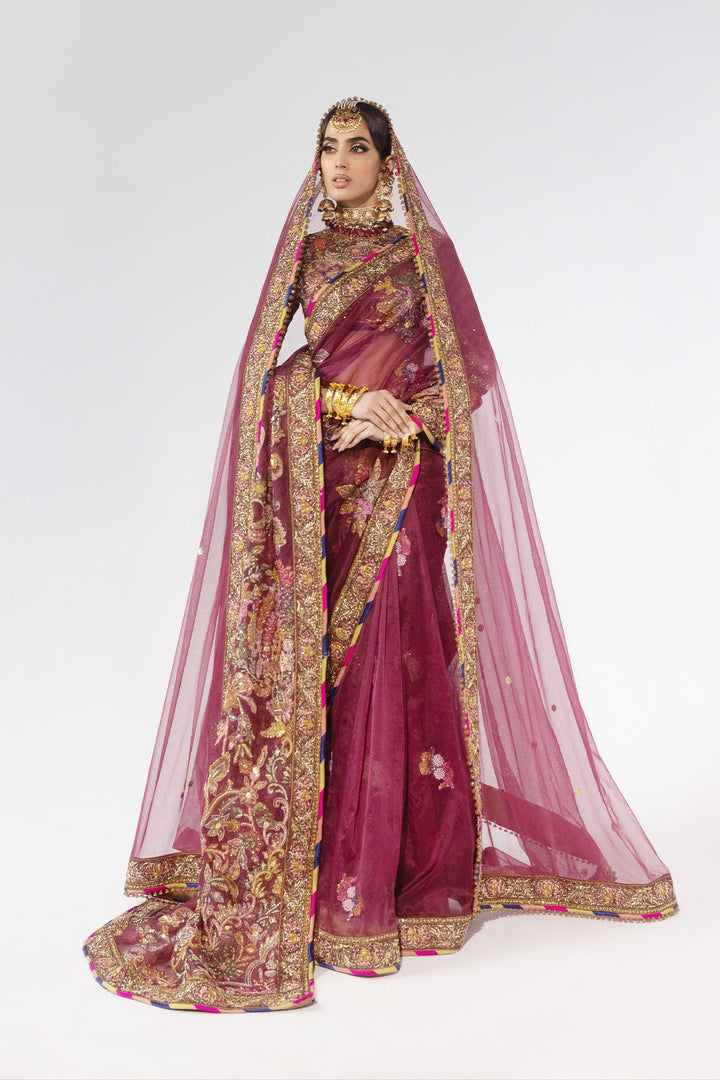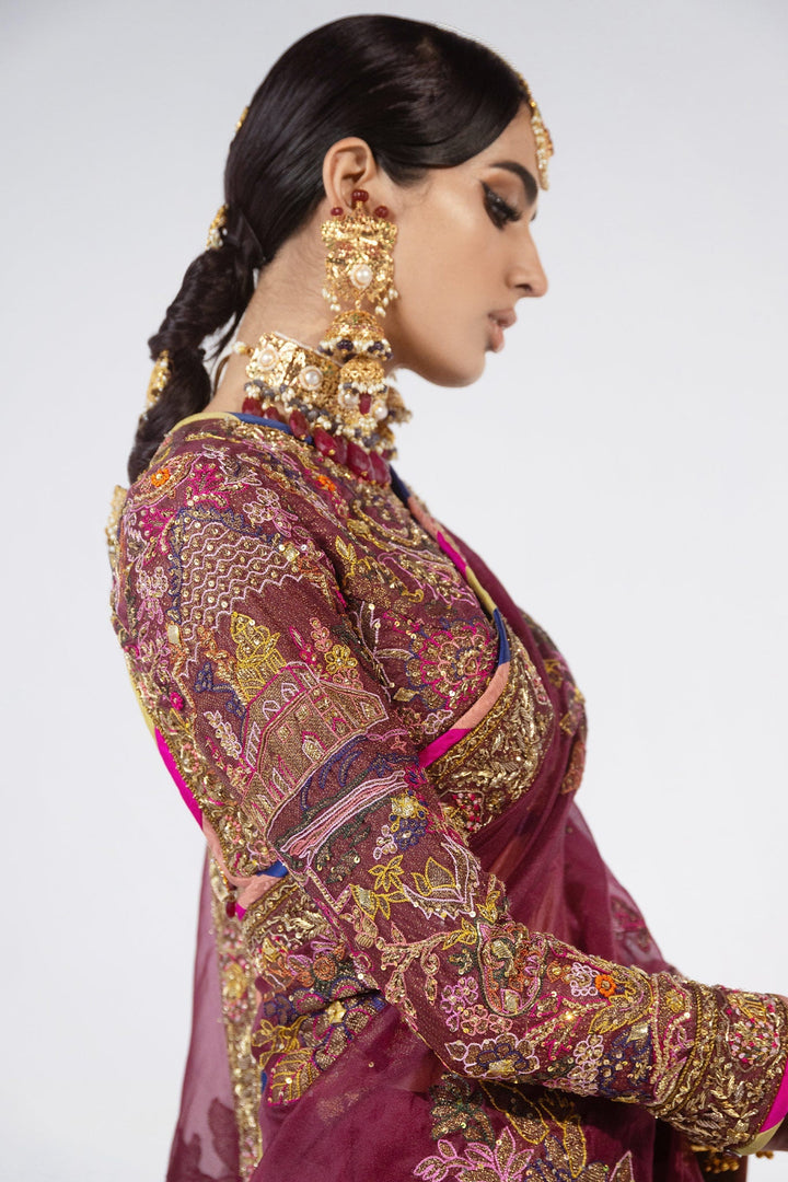 Elevate your bridal elegance with our exquisite Jaquard weaved wine color saree ensemble. This captivating piece features a stunning floral landscape intricately adorned on the biceps with opulent Zardozi work of Naqsgi, Dabka, crystals, and Resham embroidery. Paired flawlessly with a winsome Jacquard saree, boasting a resplendent Zardozi border that gracefully cascades along the hemline. Complete with a flared petticoat, this ensemble exudes timeless sophistication, making it the perfect choice for your special day.