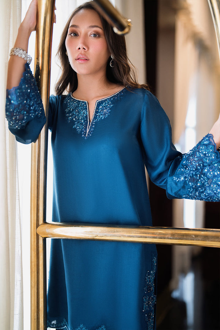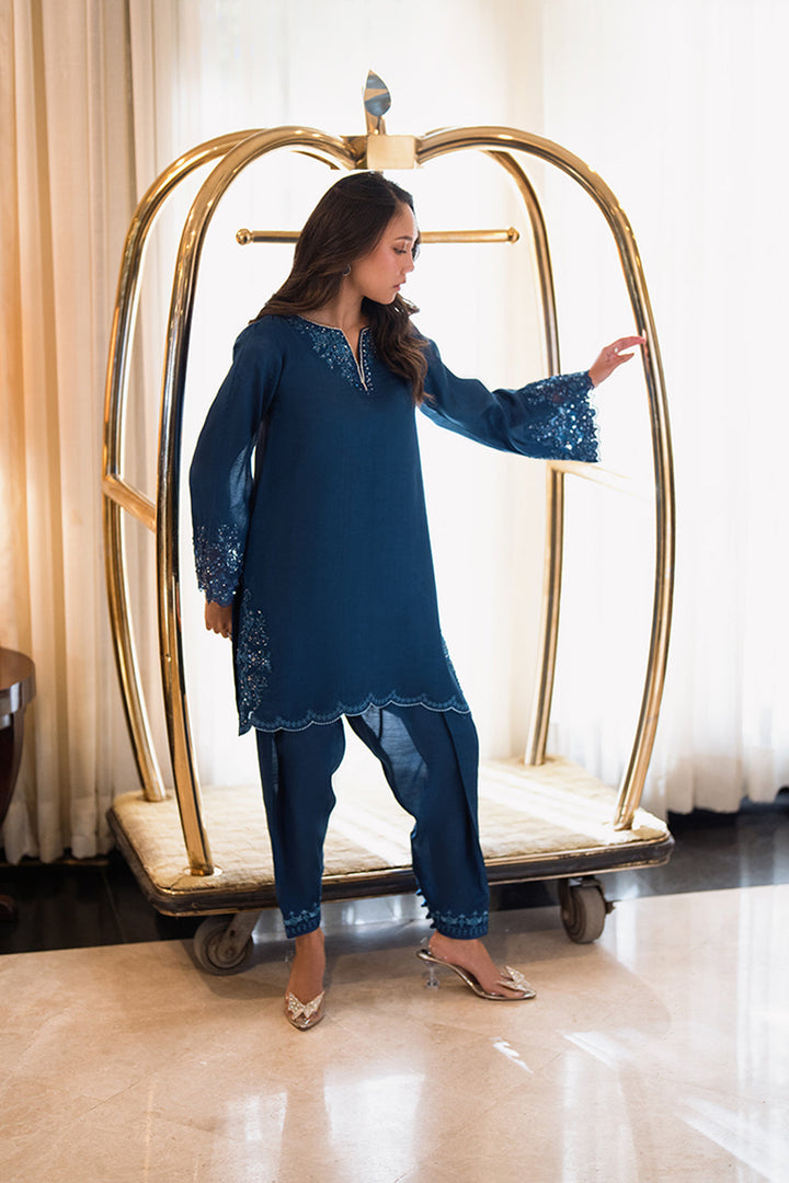 Introducing Cobalt Glow – a striking royal blue two-piece in luxurious raw silk. Adorned with intricate hand embellishments on the neckline, sleeves, and daman, this elegant design is paired with a classic straight shalwar, creating a perfect blend of tradition and modern charm.