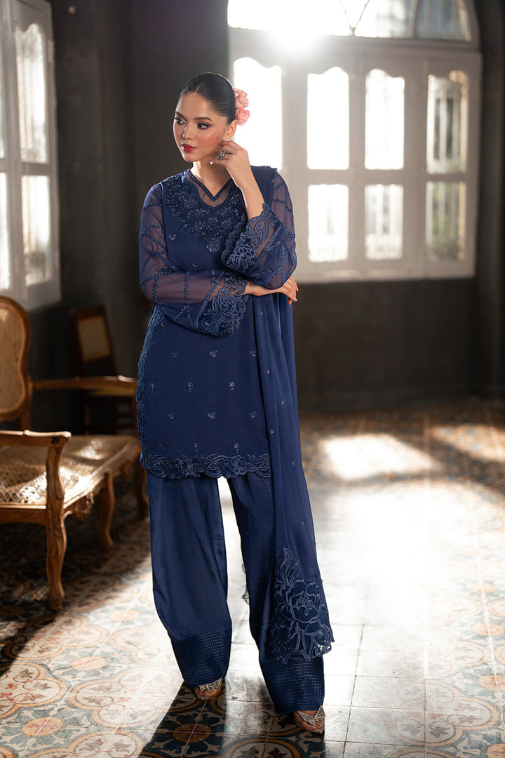 Cobalt Haze radiates a captivating charm in its rich cobalt blue chiffon fabric. The ensemble is elevated with a hand-embellished front patch, adding a touch of intricate artistry. Paired with a dazzling sequins-embroidered chiffon dupatta, this outfit shimmers with every movement. Finished with a flowing farshi shalwar, it’s a perfect choice for formal events and festive occasions that call for elegance and sophistication.