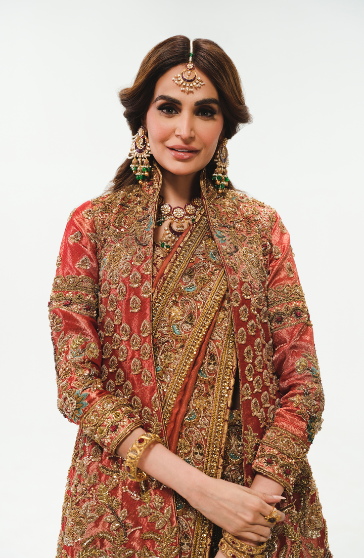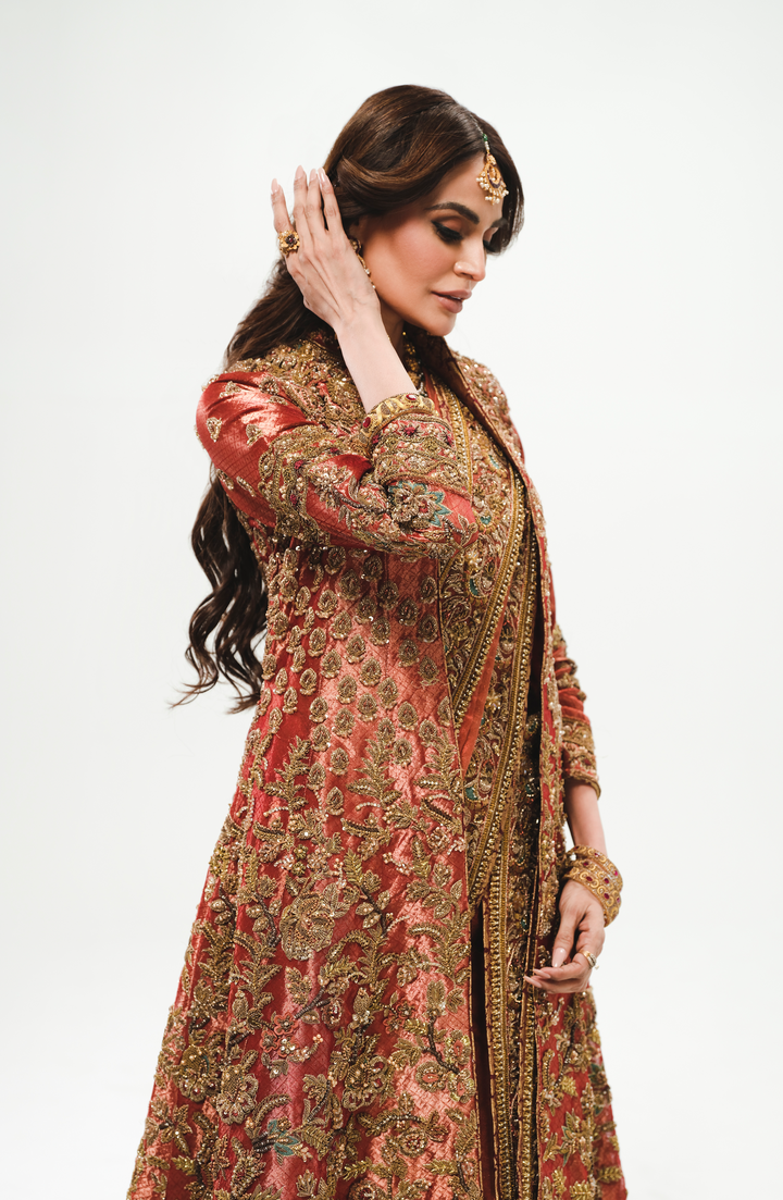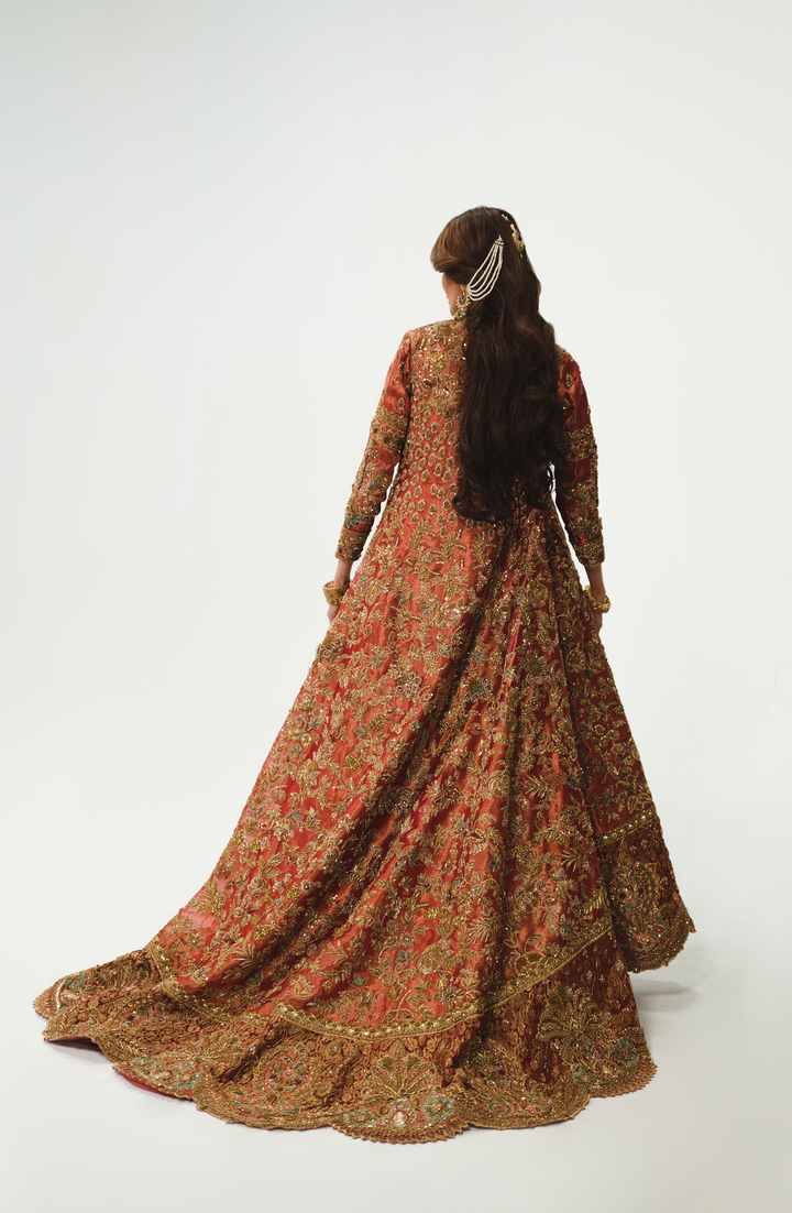 A beautifully draped copper-rust front open jacket with a dramatic back trail, meticulously adorned with 3D flowers, multi-sequinned work, and signature oxidized antique gold embellishments with teal accents. The ensemble is completed with a heavily embellished dupatta, featuring intricately embellished borders, paired with a chooridaar and jamawar blouse. Crafted from luxurious tissue fabric, this look exudes regal sophistication and timeless beauty.