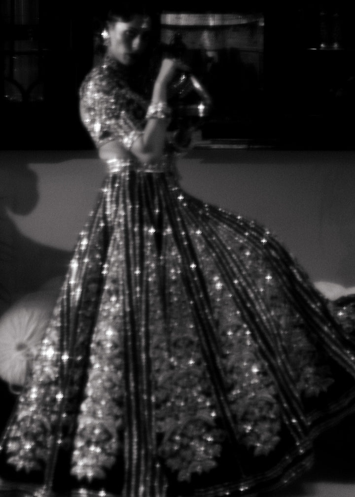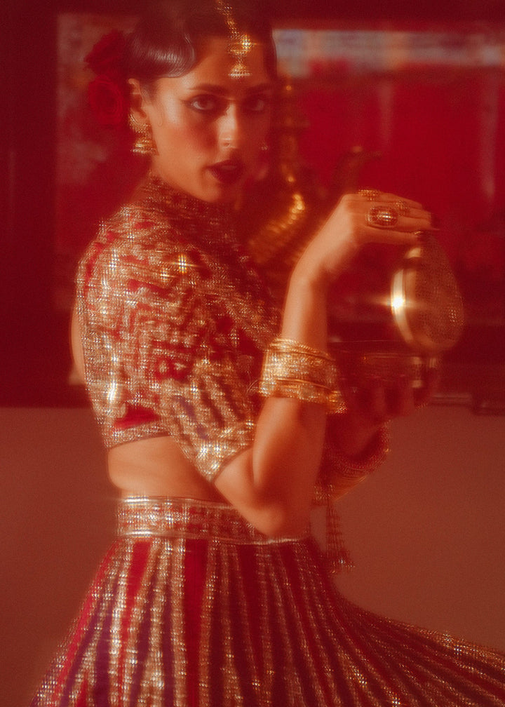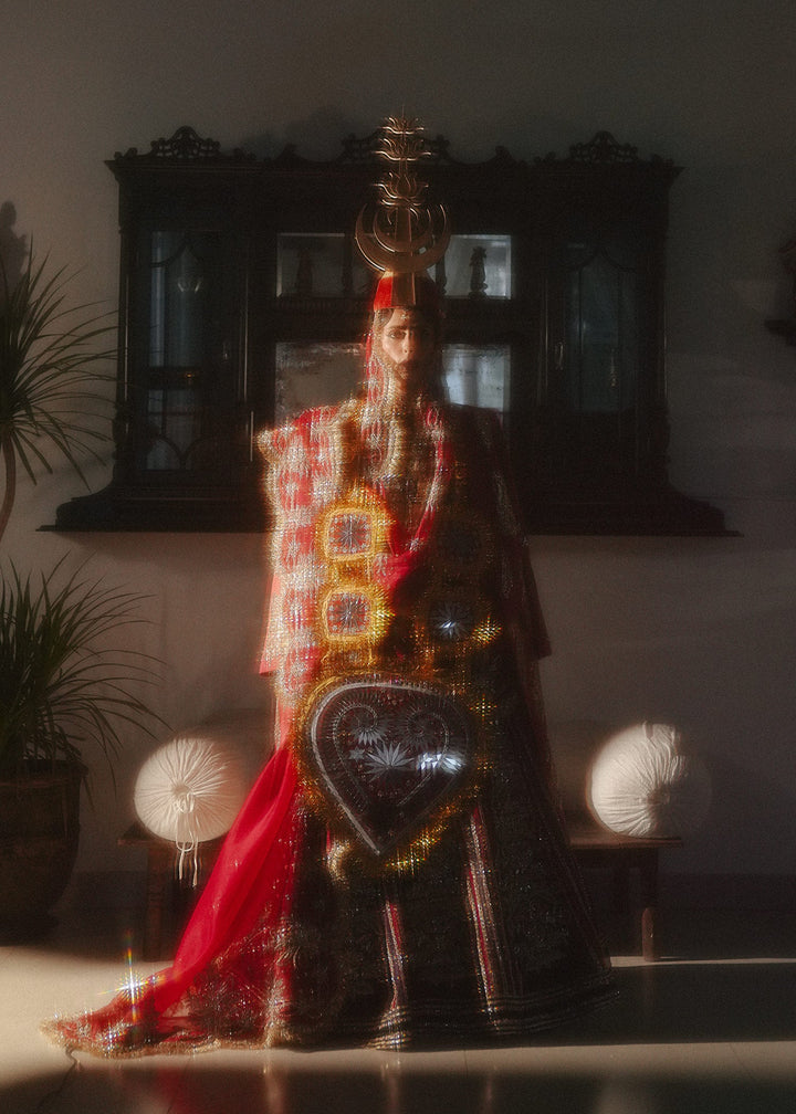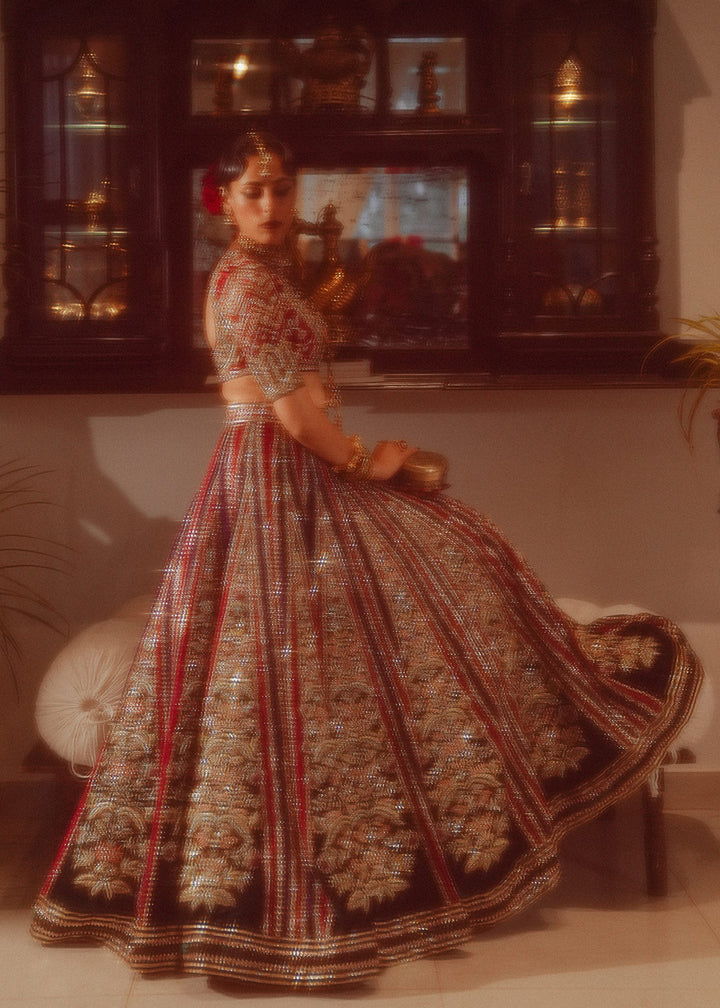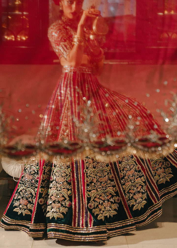 Turn heads in our unique double-colored velvet lehnga, showcasing rich red and bottle green pyramidal panels with intricate hand embellishments. Paired with a hand-embellished pure raw silk choli and a luxurious pure organza dupatta, this ensemble exudes elegance and sophistication. Perfect for any special occasion, it’s a true masterpiece of style!