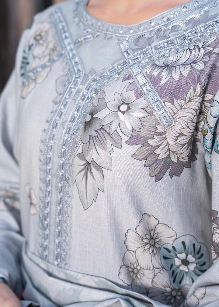 Digital printed embroidered slub khaddar shirt. Digital printed slub khaddar trousers. Digital printed slub khaddar dupatta