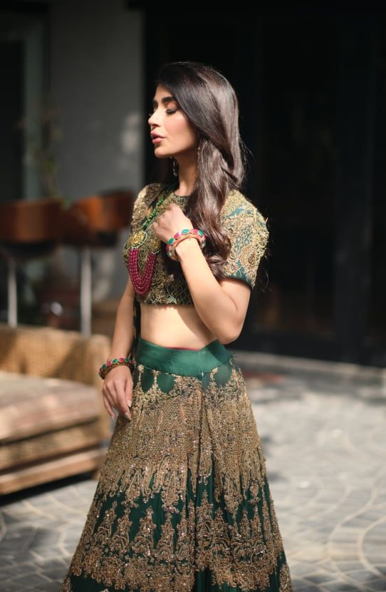 Traditional emerald green lehenga choli ensemble, embellished fully with intricate gold work, paired with a bordered chiffon dupatta.