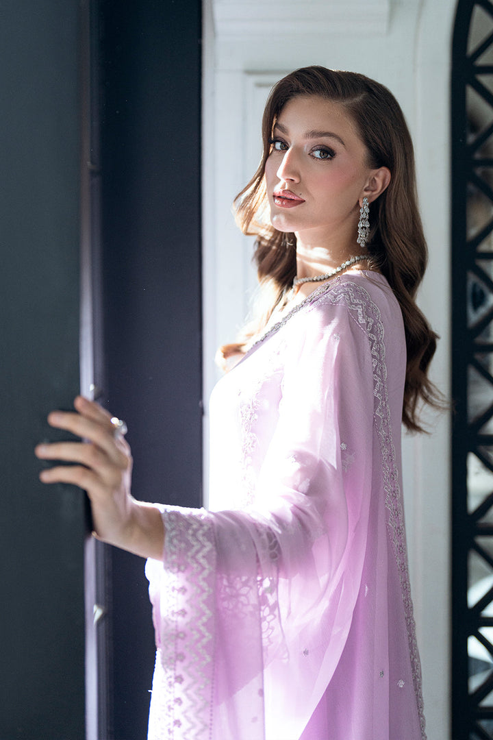 Dewy Lavender is a dreamy lilac chiffon ensemble, perfect for an elegant Eid look. The delicately hand-embellished neckline adds a touch of sophistication, while the flowing chiffon dupatta and tailored trousers complete the graceful silhouette. Soft, refined, and effortlessly chic, this 3-piece outfit is a celebration of timeless beauty.