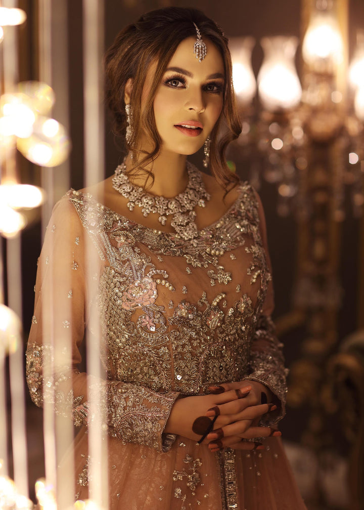This unusual shade of pastel pink embellished with silverwork is all things feminine and delicate. Our signature floral vines climbing up the border of the gown feature pink resham and crystal flowers carried by delicate twigs and leaves. A heavily crafted bodice will steal your attention at the first glance.