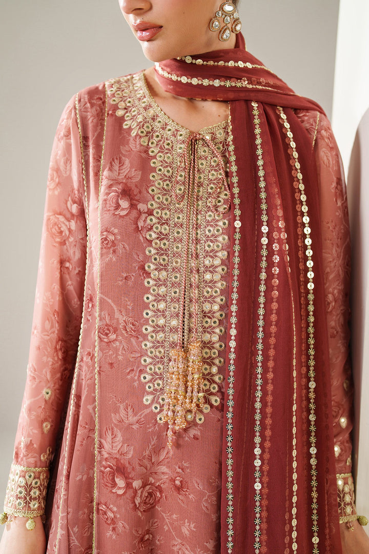 This exquisite embroidered chiffon ensemble features a digitally printed front panel paired with delicately printed chiffon side panels, sleeves, and back, creating a harmonious blend of texture and design. The intricate embroidery adorns the front, back, and sleeve borders, enhancing its refined elegance. Complemented by an embroidered chiffon dupatta and a dyed raw silk bottom, this outfit offers a sophisticated and luxurious appeal suitable for discerning tastes.
