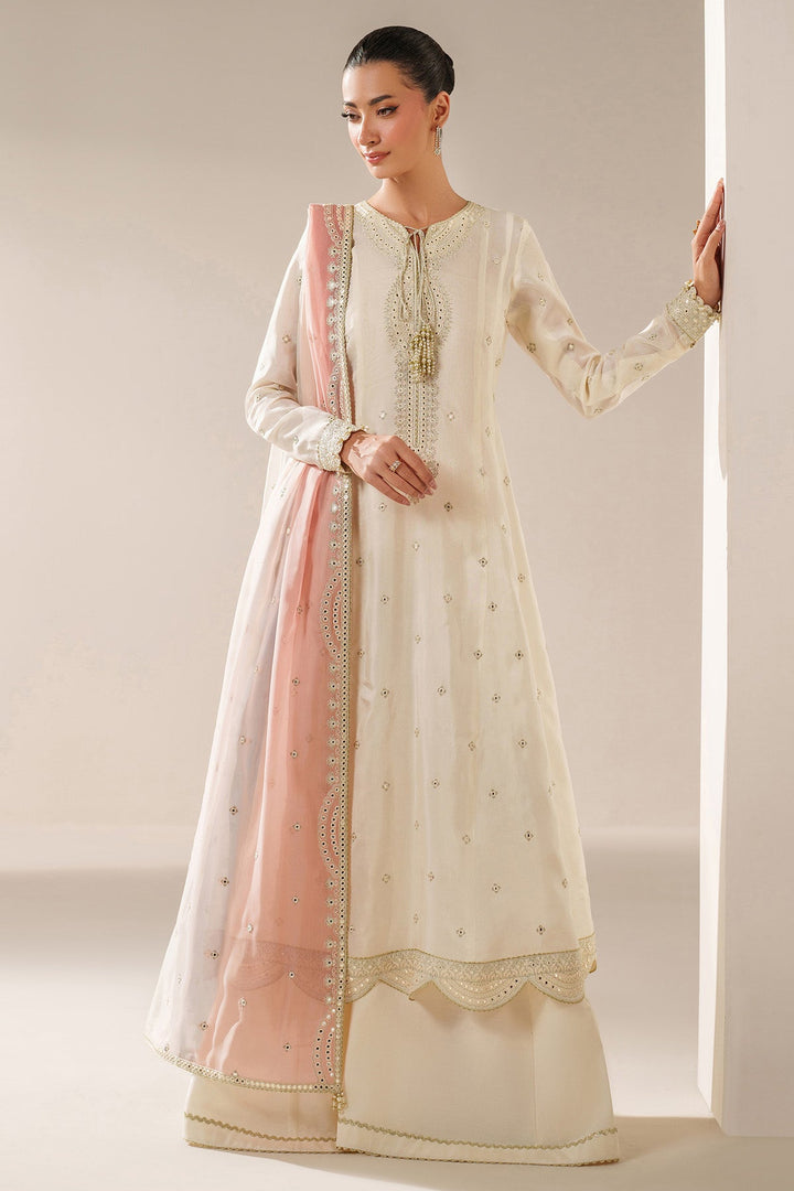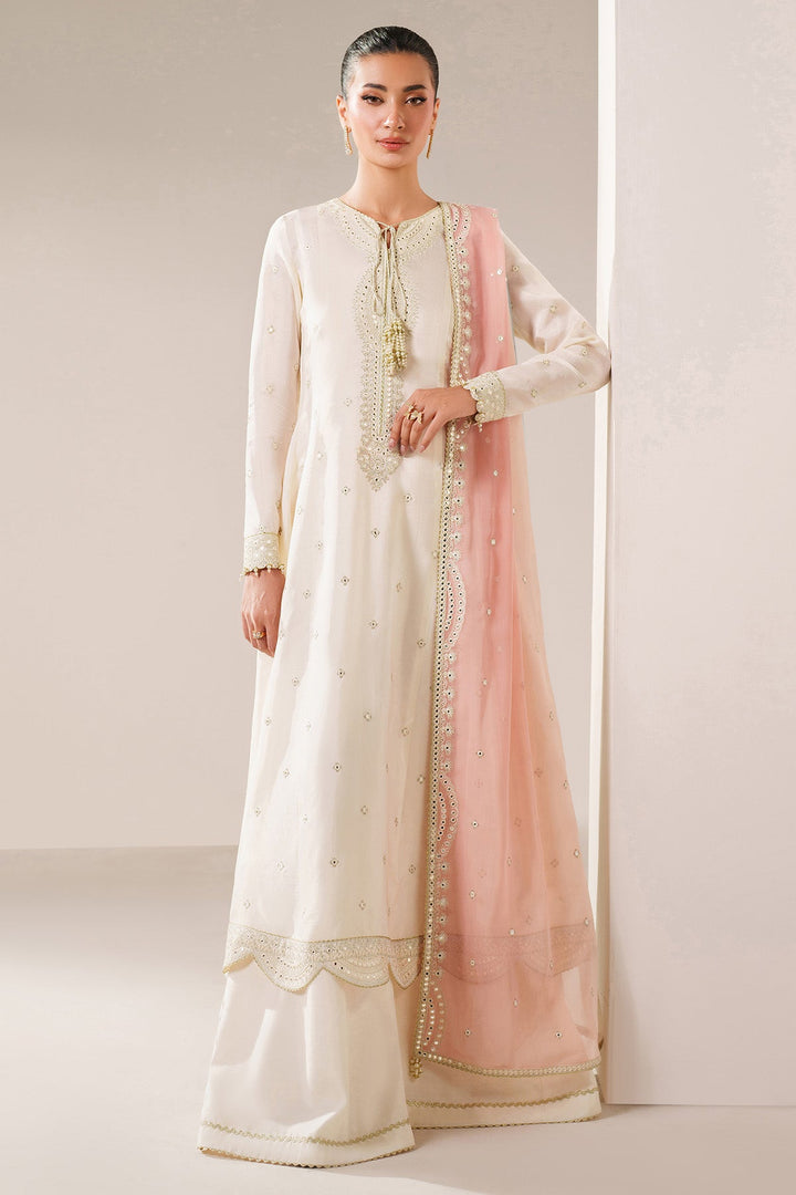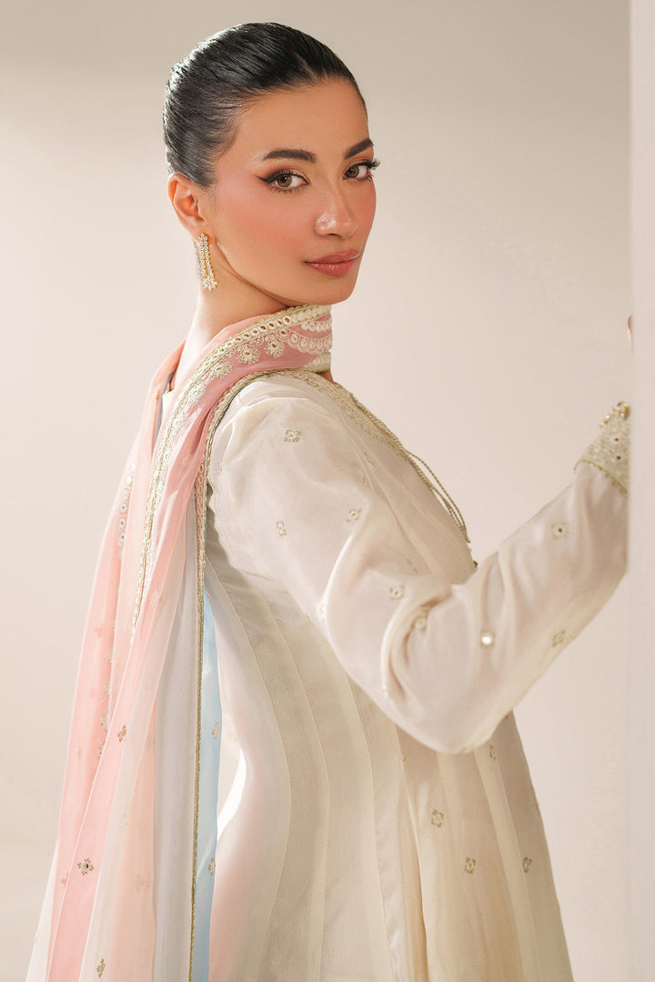 This exquisite ensemble features intricately embroidered Korean raw silk on the front and side panels, complemented by matching embroidered sleeves. The detailed embroidery extends gracefully along the front, back, and sleeve borders, enhancing its refined appeal. A digitally printed chiffon dupatta with embroidered shading and bordered edges adds a delicate contrast, while the dyed Korean raw silk bottom completes the sophisticated look. Perfect for those seeking a blend of traditional craftsmanship and contemporary elegance.