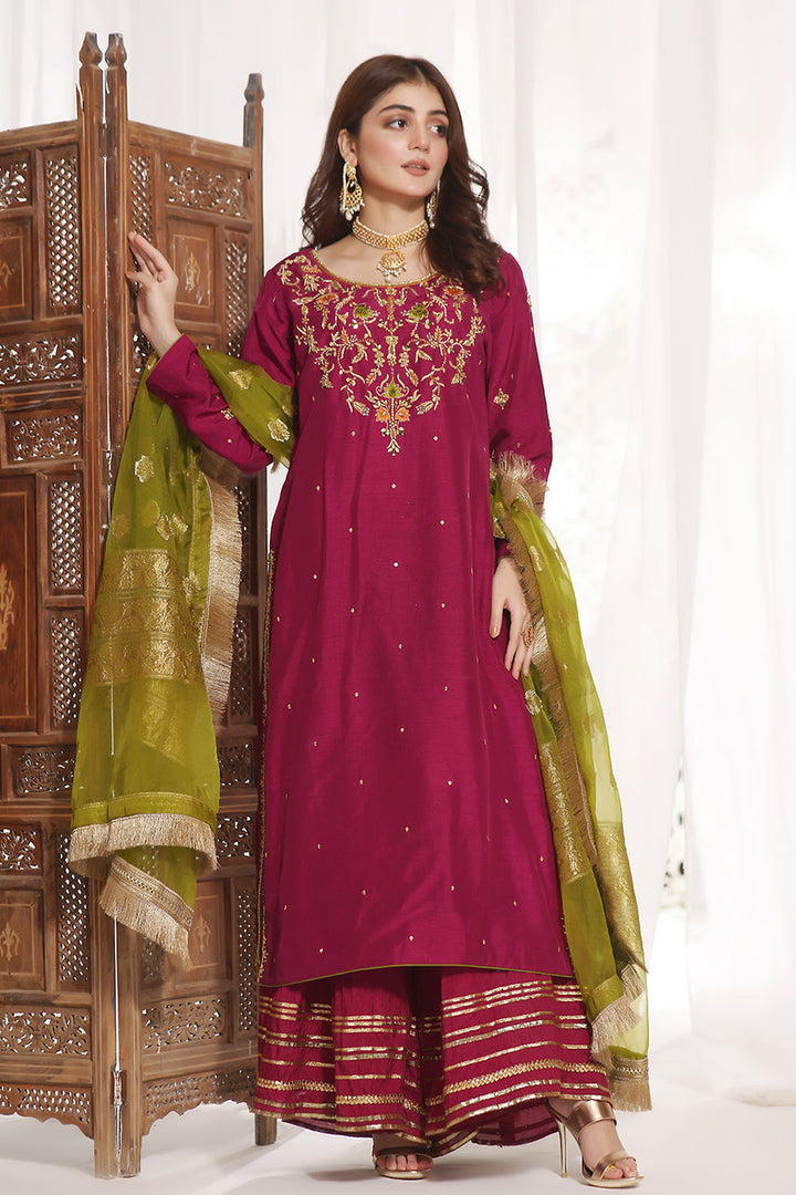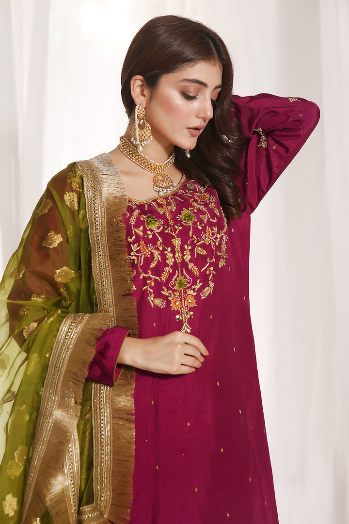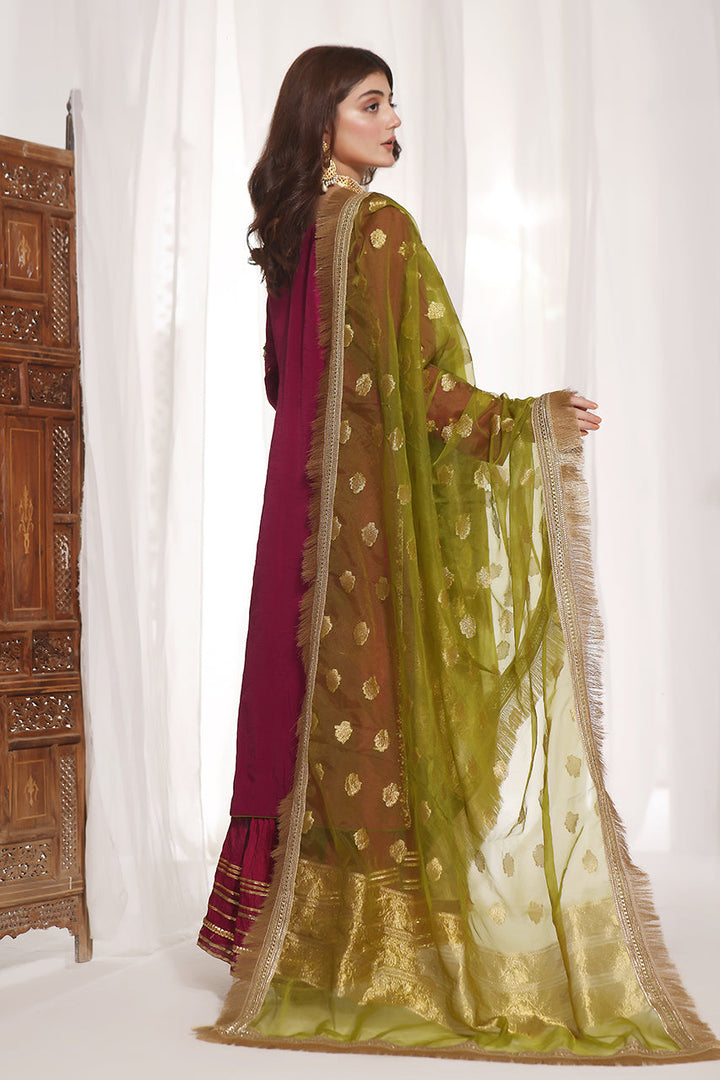 This deep purple suit is perfect for all you girly girls who love the extra pop of color in your outfits. The long silhouette with intricate kora ,dapka ,pearls and resham hand work on front and chak , combined with crushed sharara pants with multiple laces at the bottom. The organza dupatta holds eye-catching shade of dhani which create a striking combination!