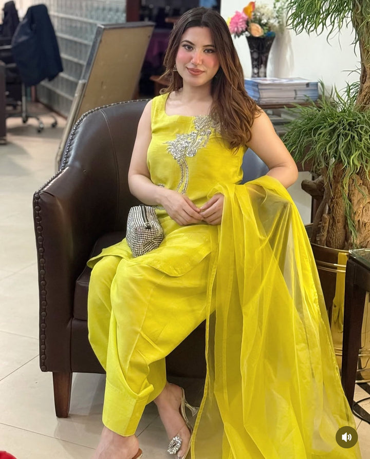 This vibrant lime-yellow outfit features delicate silver embellishments across the shirt, adding a touch of elegance to the simple silhouette, paired with Dhaka shalwar and a matching dupatta making it a stylish choice for festivities.