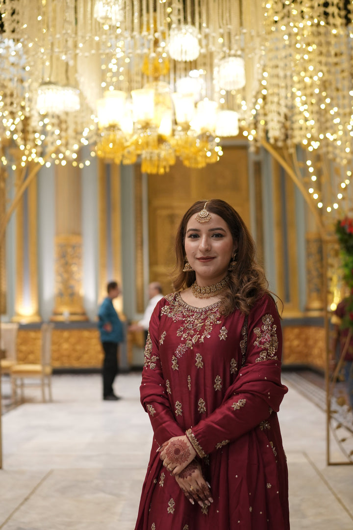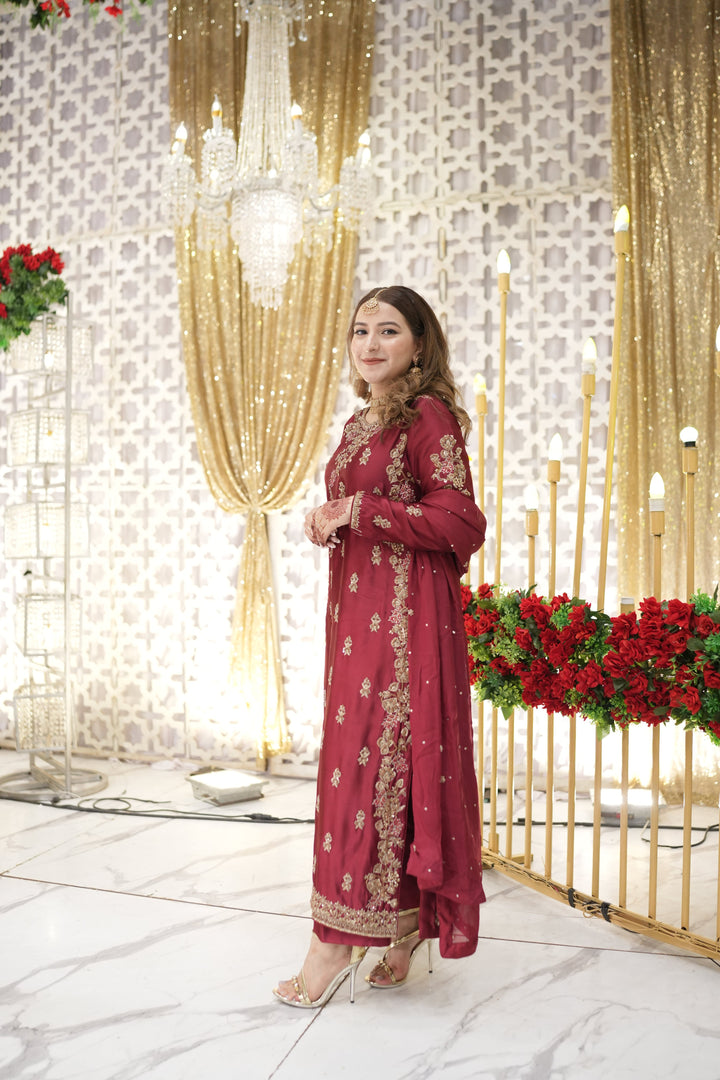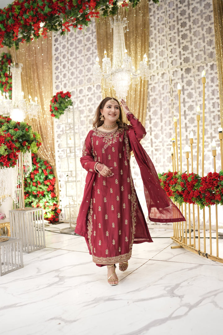 Embrace regal charm with our Royal Merlot Ensemble, a rich maroon outfit designed for graceful glam. With exquisite gold thread and sequin embroidery scattered across the shirt and dupatta, this outfit radiates sophistication and festivity. The straight cut and tailored finish provide a classic look, while the intricate neckline work adds a touch of luxury. Perfect for wedding functions or festive nights.