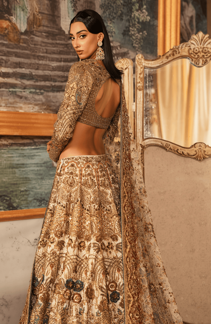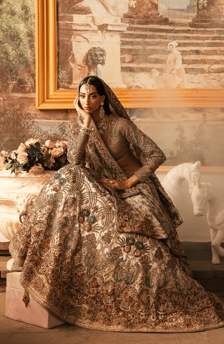 A breathtaking white bridal lehnga choli that whispers romance and grace. The delicate jamawar choli, adorned with intricate jaal work, flows into an ethereal silk lehenga, brought to life with vibrant sucha taanka and antique zardozi. A sheer net dupatta, framed with a deep red border and a touch of blue piping, adds the perfect touch of elegance to this dreamlike ensemble.