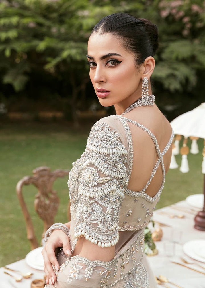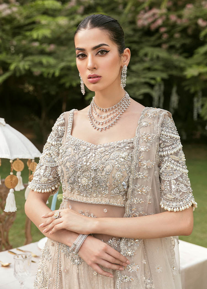 Floating floral bouquets of pearls and crystals adorn this beautiful nude side slit gown. Don’t miss the chunky scalloped detailing on the elbow length sleeve which present the perfect fusion for the modern day brides. Paired with a crushed voluminous brocade sharara and a delicate net dupatta finished on four sides.