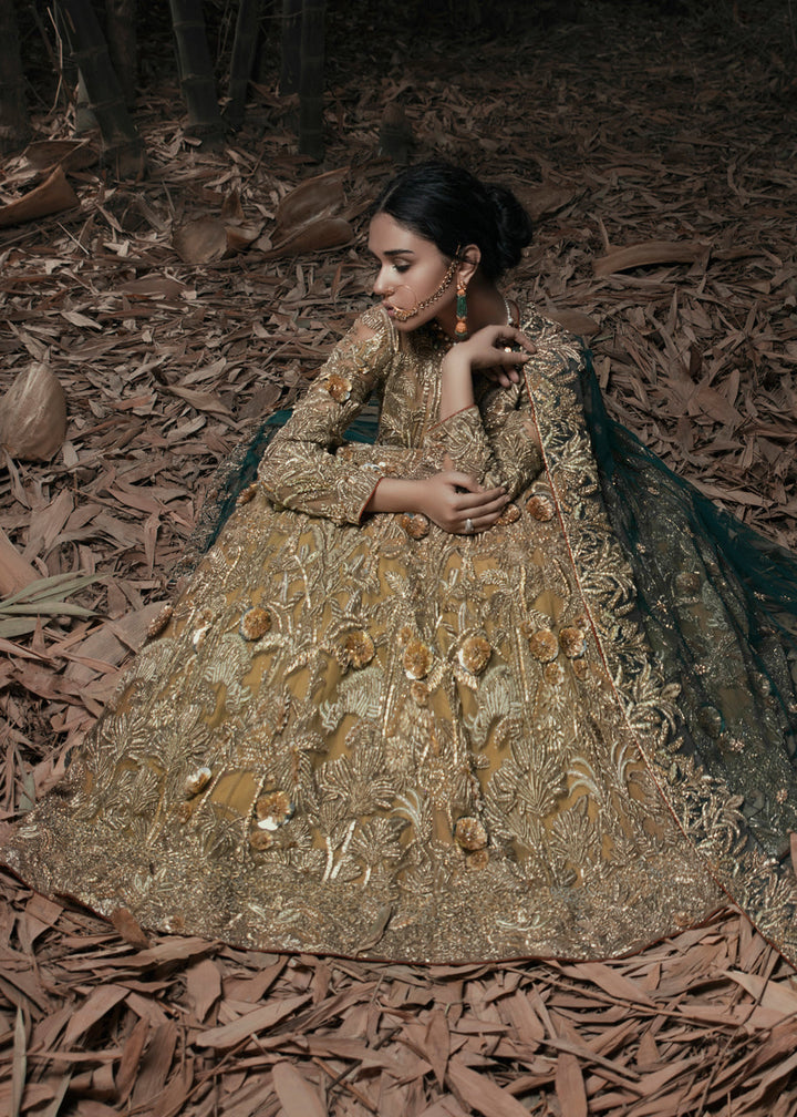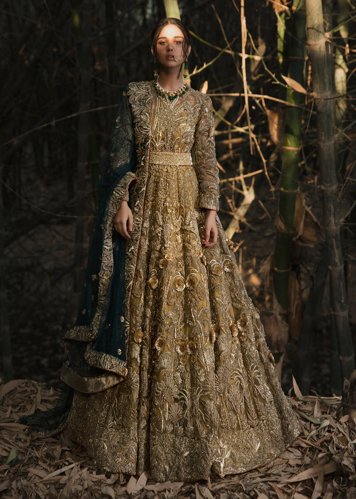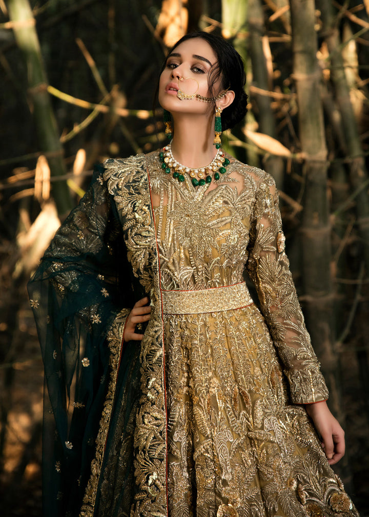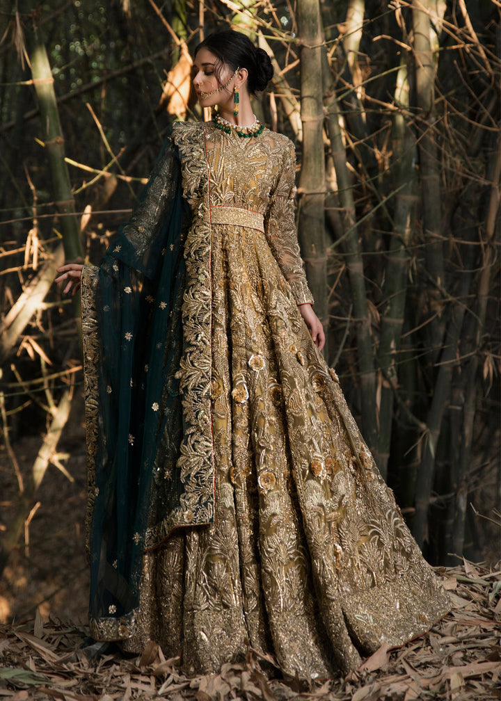 This garment is a floor length net dress with a round neck and full sleeves. The dress is fitted till the waist and falls into a flair skirt from the waist to the floor. Heavy golden floral embellishments start from the floor gradually line up to the neck and sleeves. 3D embellished flowers give another dimension to the already heavy embellishments on the skirt and the sleeves. A green net dupatta accompanies the garment. The dupatta has embellished borders on all four sides with a thick border on one lengthwise side. A floral motif spray is scattered on the dupatta. The garment is lined with medium silk and finished with rust orange piping.