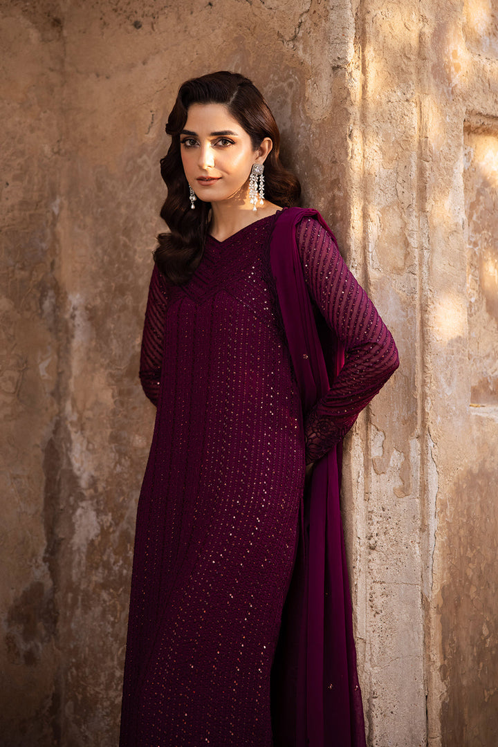 Introducing Garnet Majesty, a rich burgundy ensemble that radiates elegance. Adorned with a shimmering sequin-embroidered chiffon dupatta, this luxurious piece is perfect for making a bold statement at any occasion