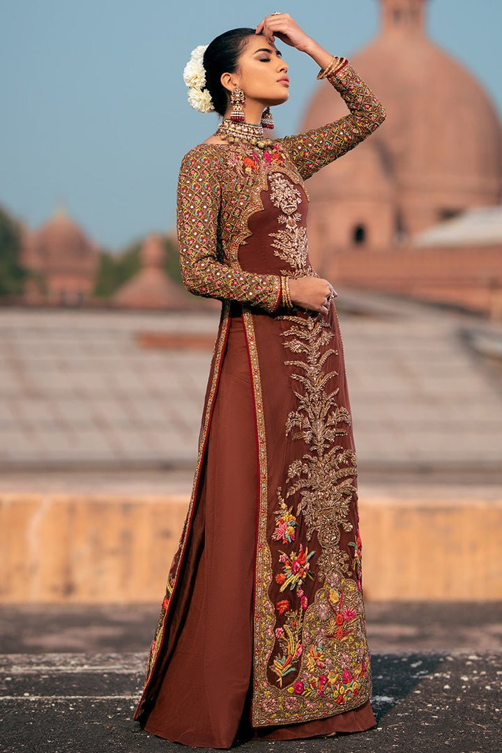 Chocolate brown net floor length long shirt with intricately hand crafted silk thread and zardozi embroidery layered with silk corset paired with silk pants finished with hand made loop buttons & signature inhouse finishes