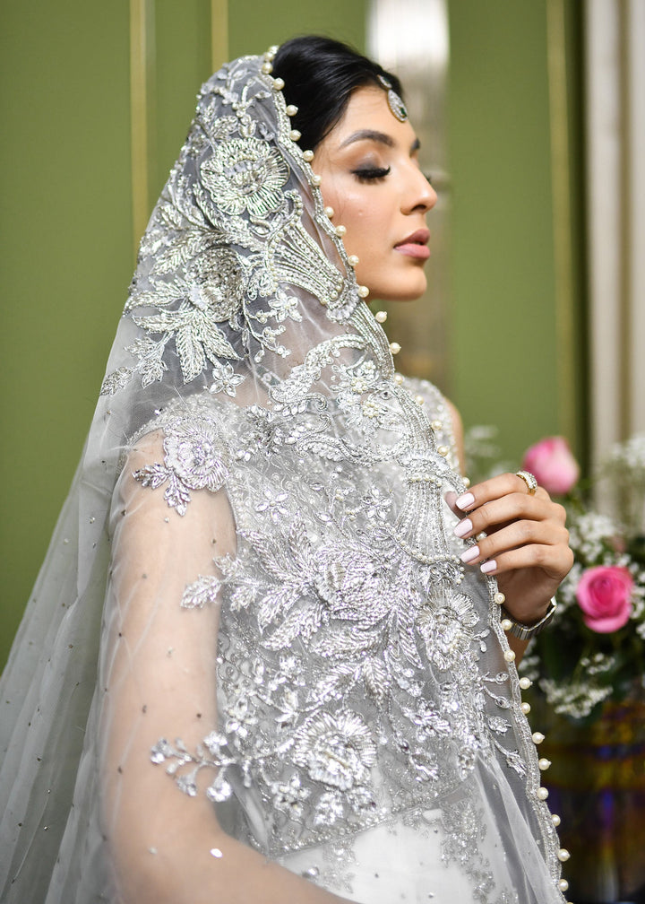 Densely handworked shirt paired with a fuss free white net train skirt for added oomph. We’ve paired this with a veil dupatta featuring exquisite floral bouquet motifs to add to the look for your stunning bridal look which stays within desirable budgets.