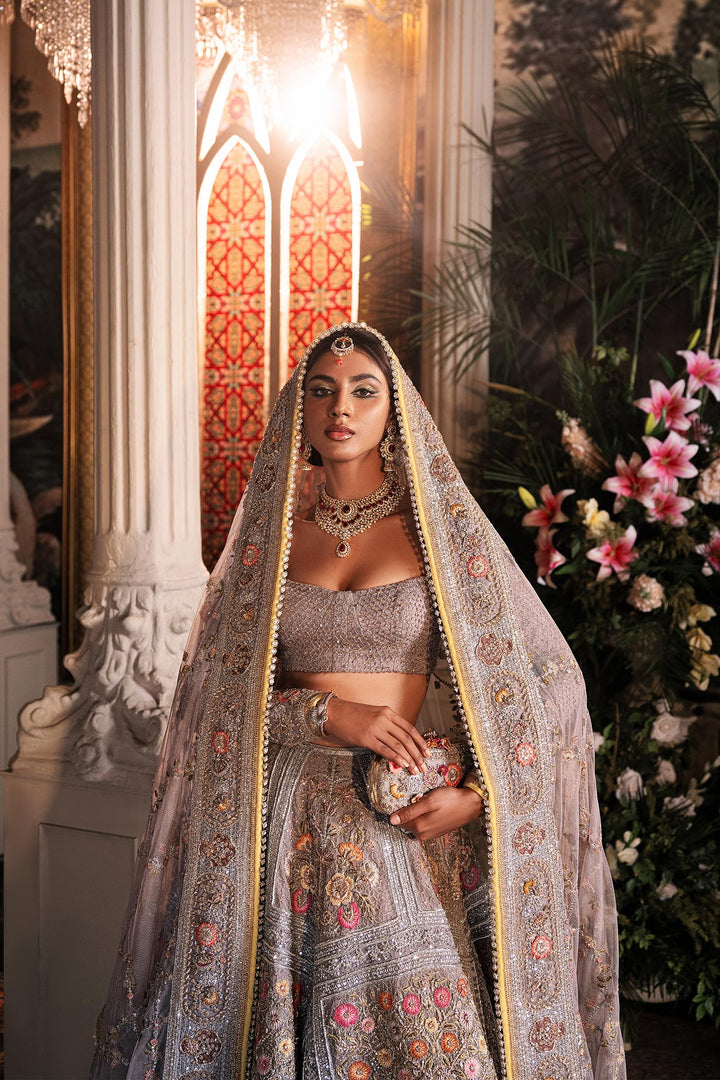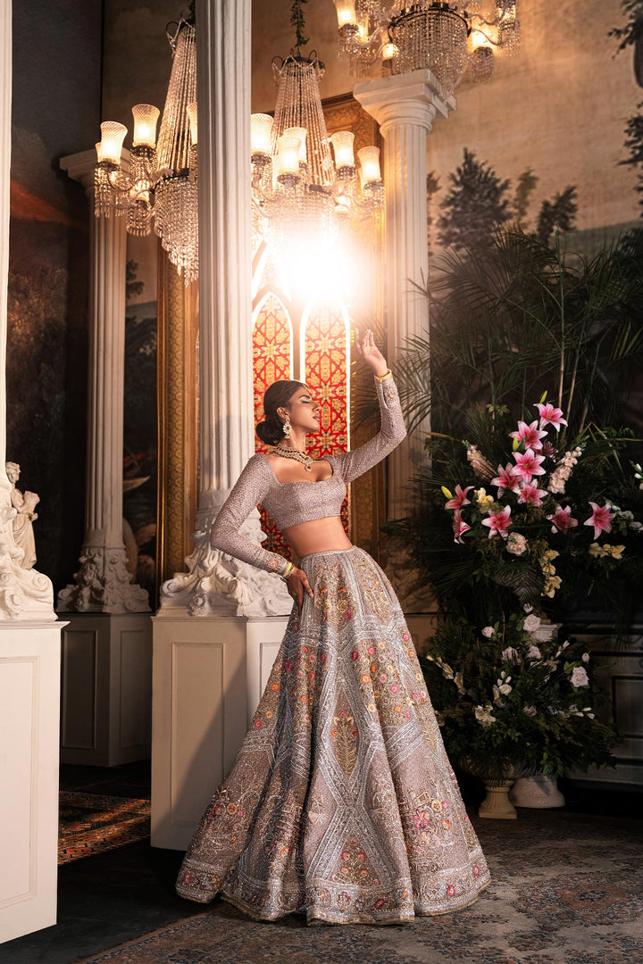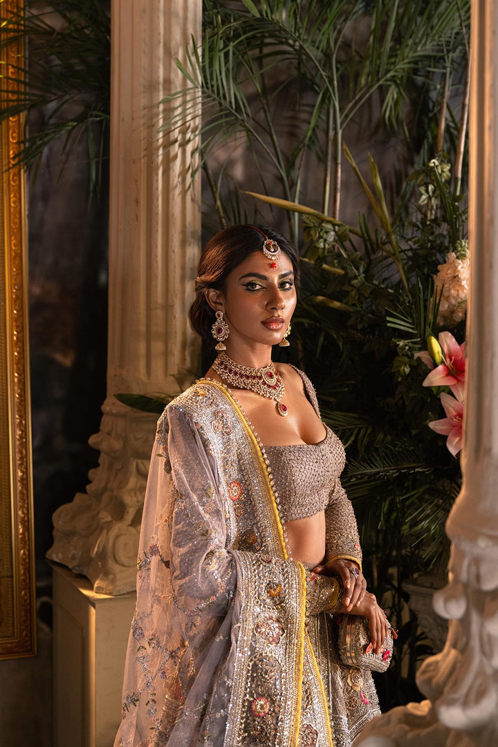 The net fabric base features a captivating geometric design embroidered with a combination of resham thread and shimmering sequins. This contemporary motif is further elevated by intricate zardozi work incorporating naqshi, dabka, and crystals, creating a mesmerizing interplay of light and texture. The lehenga is paired with a beautifully complementing choli and a dramatic dupatta, all echoing the same stunning geometric embroidery and zardozi work. This steal grey ensemble is perfect.