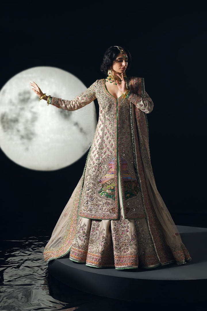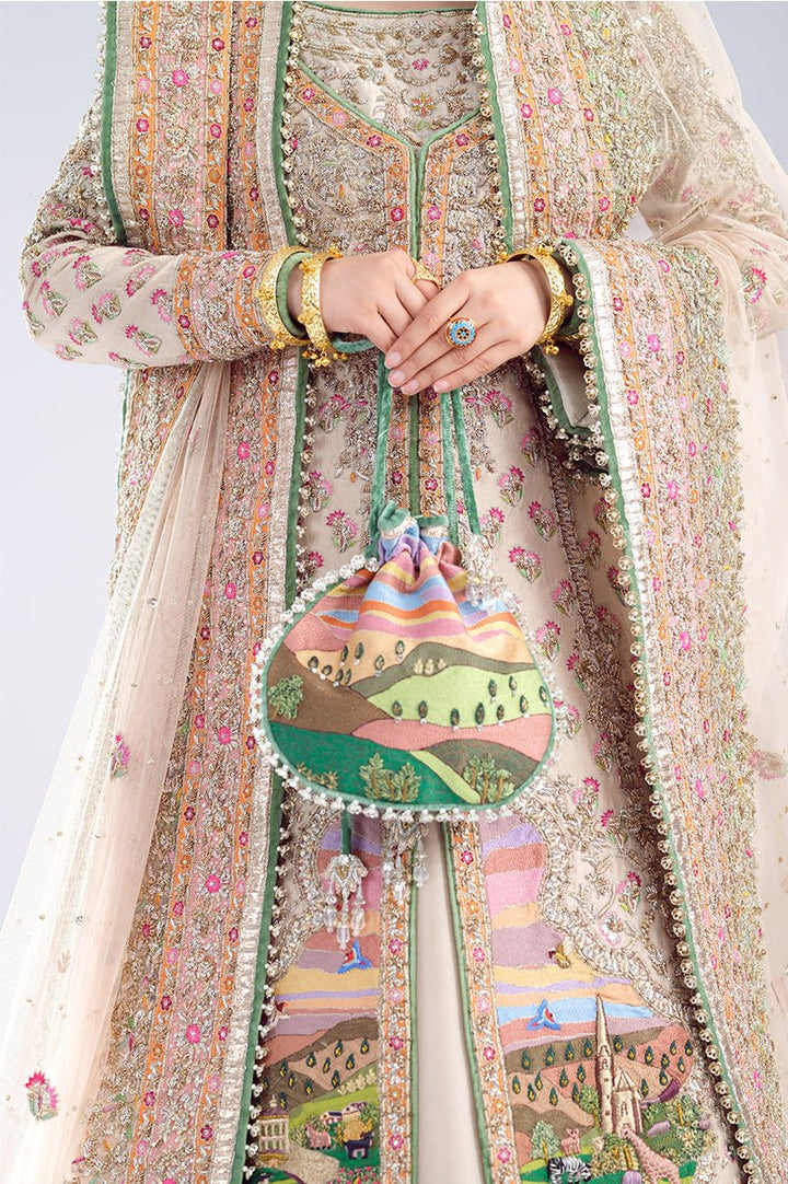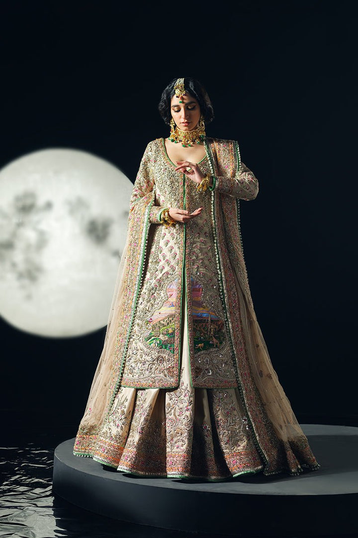 A timeless tale of heritage and elegance, woven into every thread. Inspired by the beauty of our rich culture, Hoshruba, is meticulously designed in mesmerizing ivory colour, with an intricately embellished, long raw silk shirt and a stunning, lehnga that boasts a bold border. This exquisite bridal is paired with a regal net shawl dupatta and an exquisite kundan zari pouch.