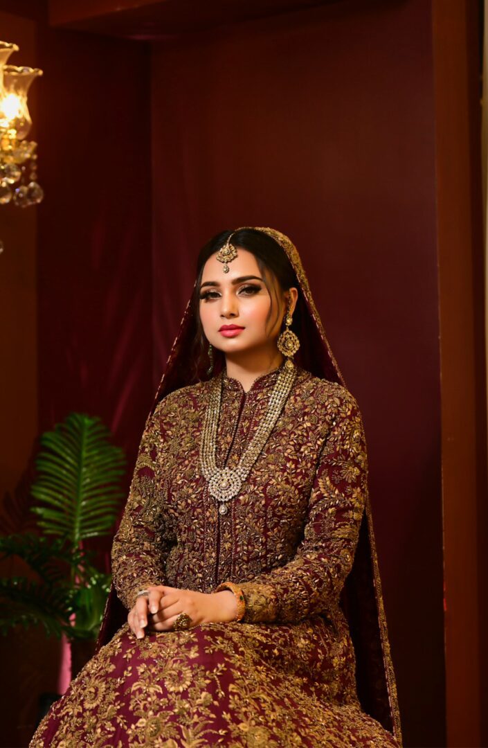 Traditional maroon choli and lehenga made in raw silk fabric, fully embellished with antique gold work and paired with a chiffon dupatta.