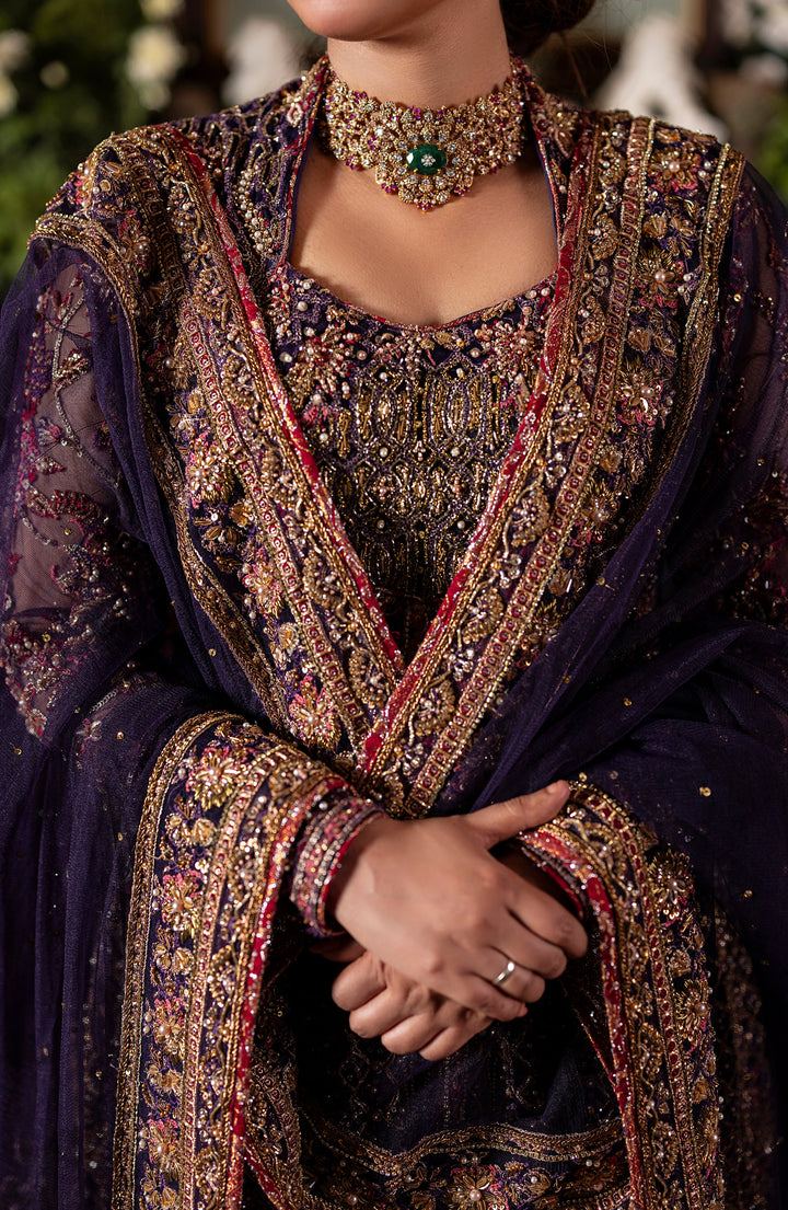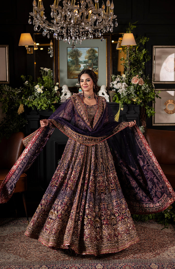 Step into elegance with Deluxe 05 – an Irish Purple front-open gown embellished and embroidered to perfection. Paired with a jamawar lehanga and a net dupatta, the ensemble features rich red accents for a striking appearance.