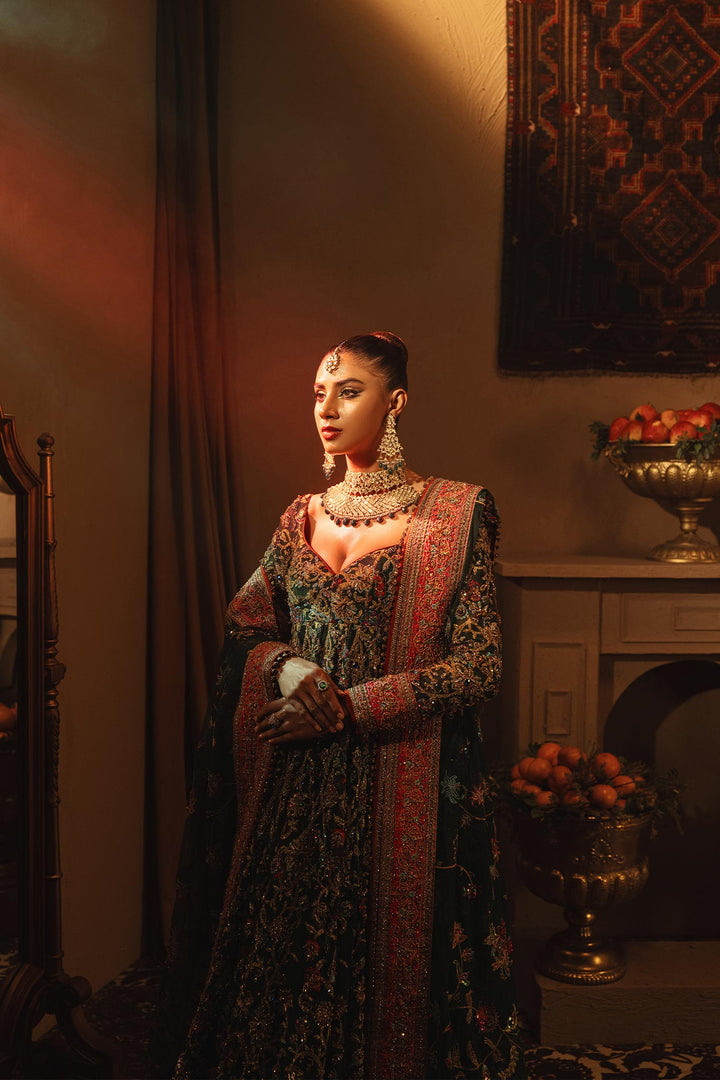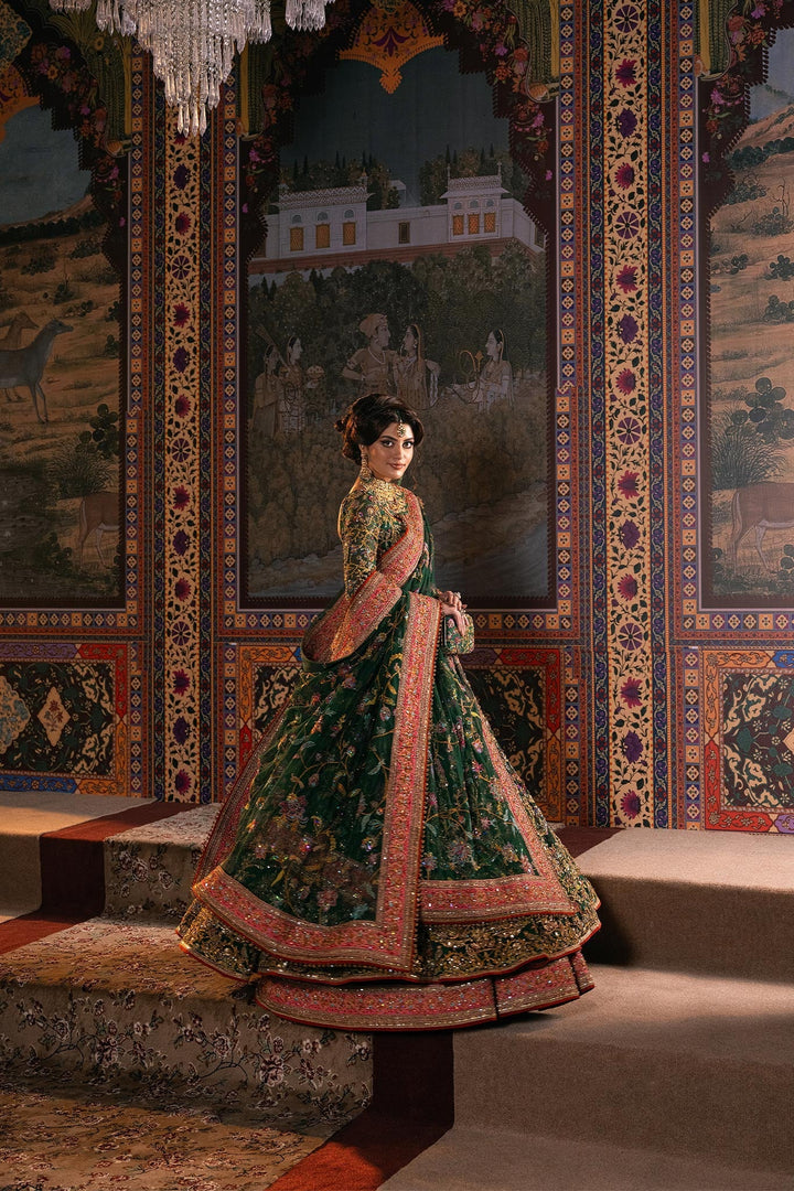 Envision yourself a captivating bride in this enchanting bottle green ensemble. The net pishwas boasts a base adorned with beautiful resham embroidery in a spectrum of colors, further accentuated by shimmering sequences. This captivating foundation reaches new heights with intricate zardozi work, adding a touch of regal elegance. The outfit flows seamlessly into a luxurious silk lehenga, finished with exquisite borders for a touch of sophistication. To complete the look, a delicate net dupatta reflects the pishwas embroidery, creating a cohesive and unforgettable statement for your special day.